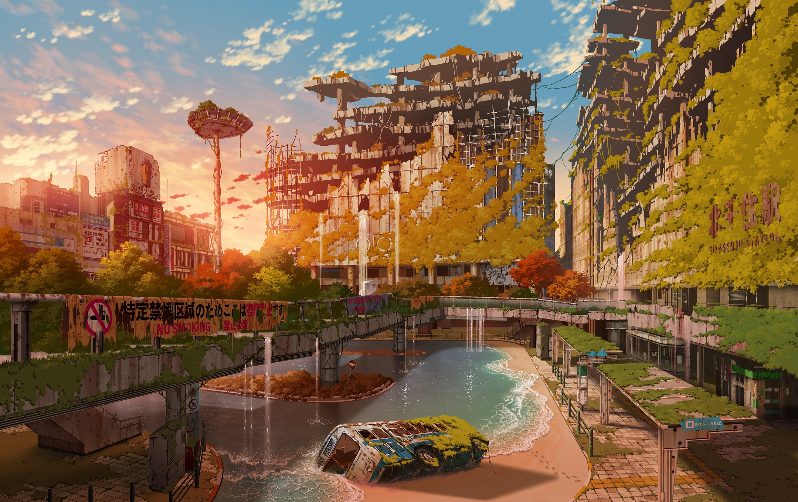 abandoned autumn blue_sky broken_window building bus cloud dilapidated english_text footprints highres lake moss motor_vehicle no_entry_sign no_humans no_smoking original outdoors overgrown post-apocalypse railing road_sign ruins rust scenery sign sky sunset tokyogenso tower translation_request tree water waterfall waves wreckage
