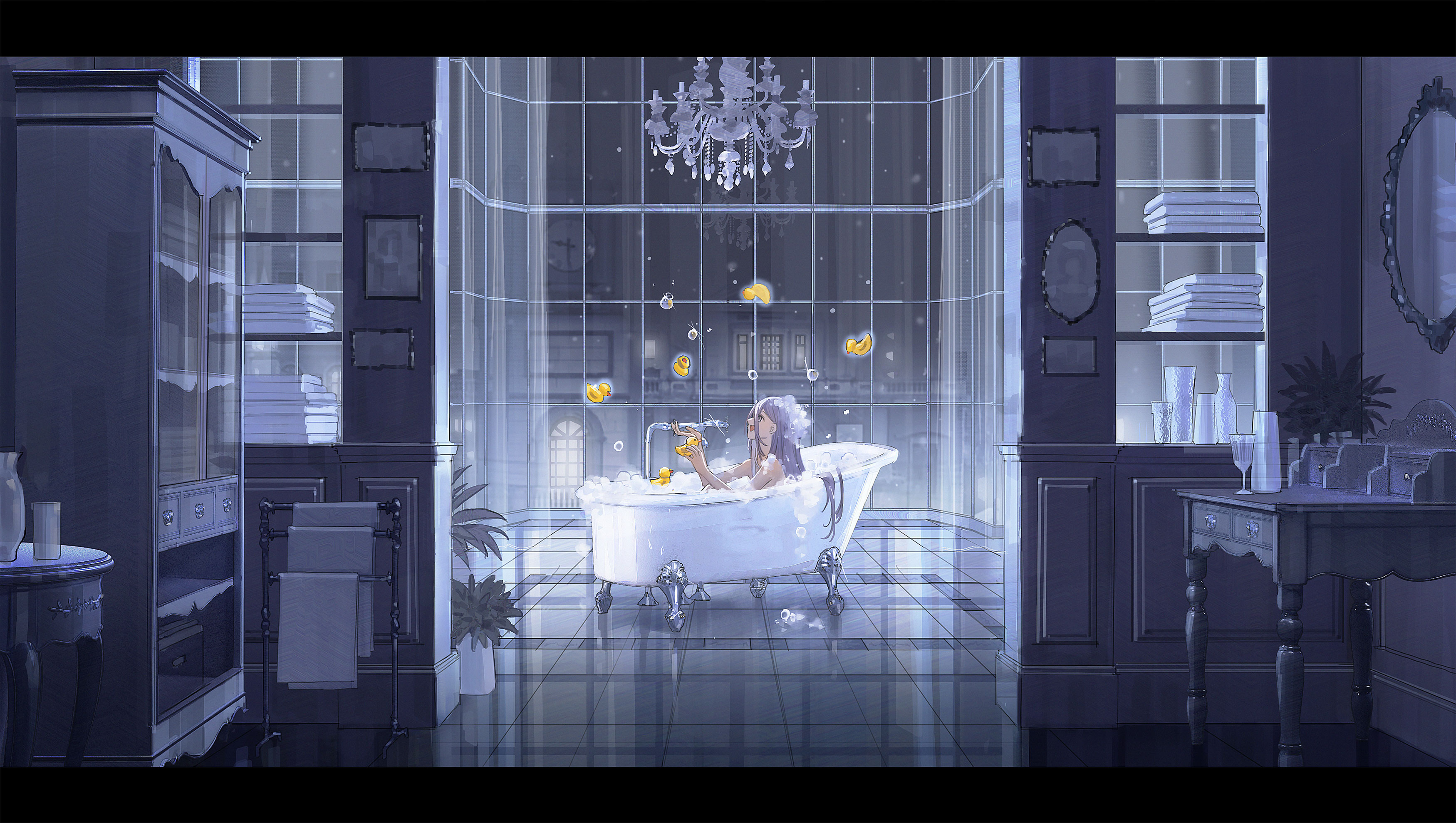 1girl absurdres air_bubble bathing bathroom bathtub bubble chandelier chinese_commentary commentary_request cup drawer drinking_glass floating floating_object foam from_side highres holding holding_toy indoors kimonogo long_hair mirror night open_mouth original plant potted_plant purple_hair reflective_floor rubber_duck scenery shelf smile solo table towel toy wide_shot window