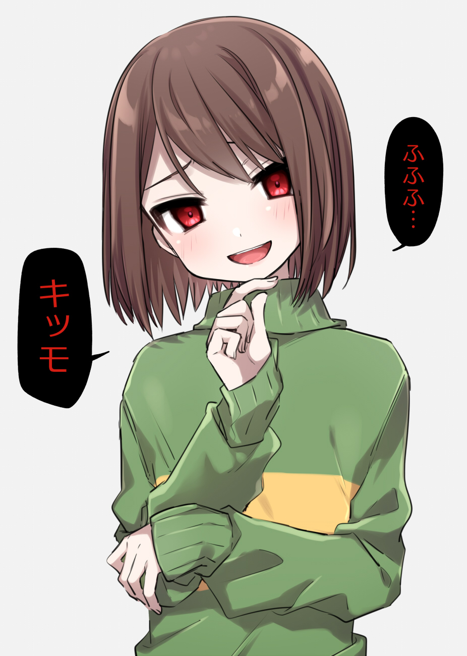 1other blush bob_cut brown_hair chara_(undertale) finger_to_own_chin fingernails green_sweater grey_background head_tilt highres leftporygon long_sleeves looking_at_viewer open_mouth red_eyes short_hair smile speech_bubble straight_hair striped_clothes striped_sweater sweater teeth translated turtleneck turtleneck_sweater undertale upper_body upper_teeth_only utdr_(toby_fox) yellow_sweater
