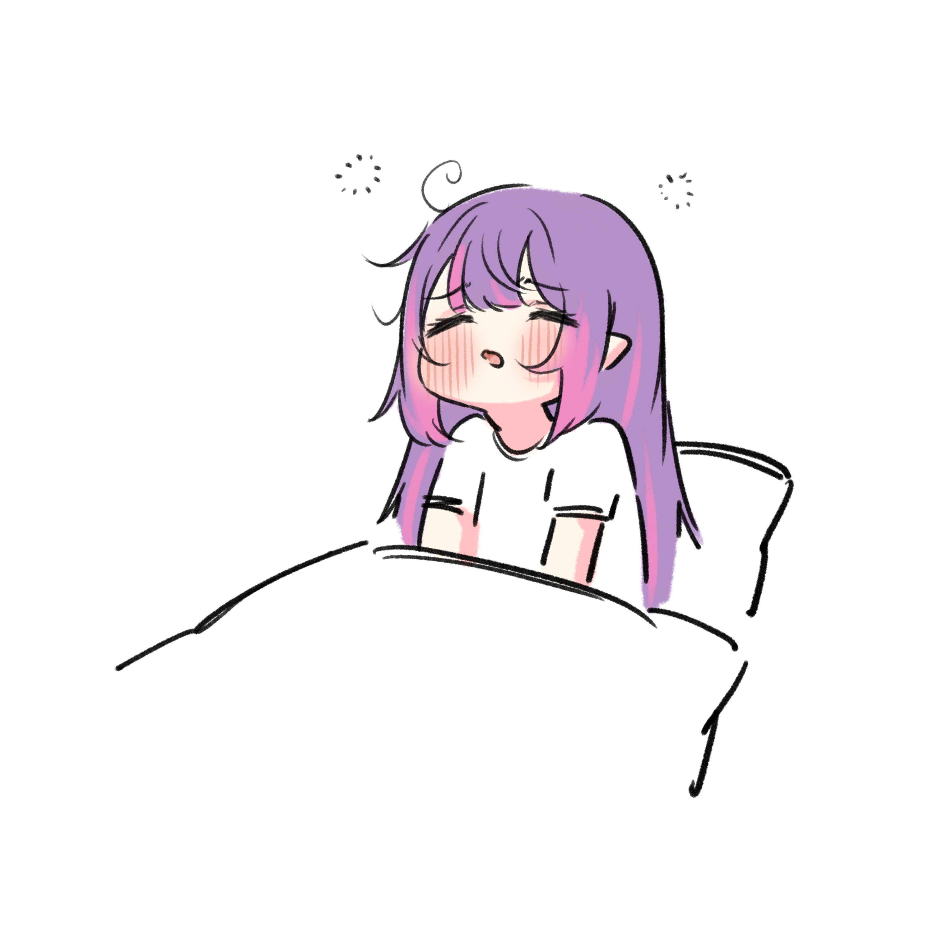 absurdres alternate_costume buibui chibi chibi_only closed_eyes hashtag-only_commentary highres hololive long_hair multicolored_hair on_bed pink_hair pointy_ears purple_hair shirt squeans streaked_hair t-shirt tokoyami_towa under_covers virtual_youtuber waking_up white_shirt