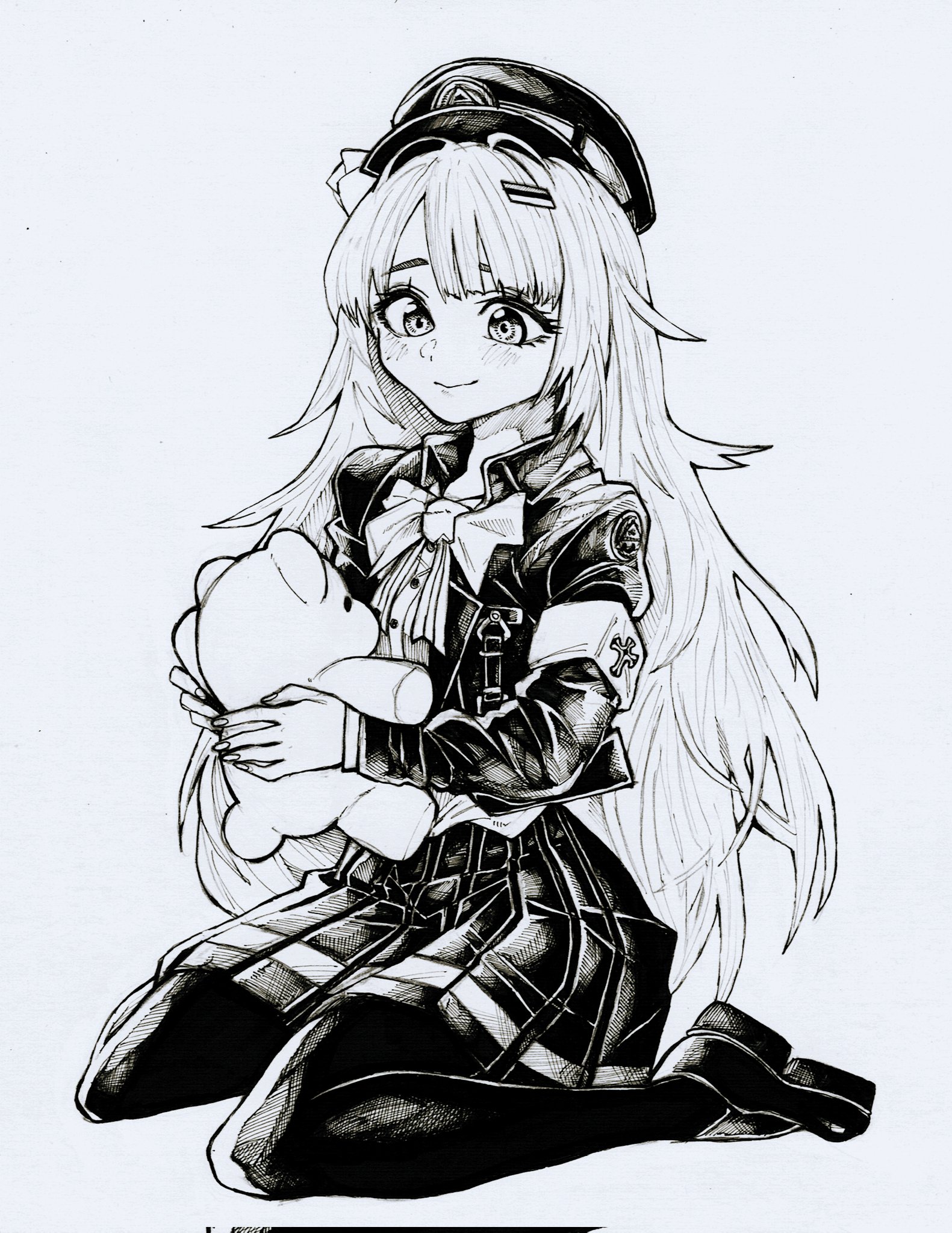 1girl blush bow bowtie closed_mouth dmonochrome gloves goddess_of_victory:_nikke greyscale hair_ornament hat highres holding jacket kachihoko loafers long_hair military_hat monochrome pantyhose pleated_skirt shirt shoes simple_background sitting skirt smile soline_(nikke) solo stuffed_animal stuffed_toy teddy_bear white_background