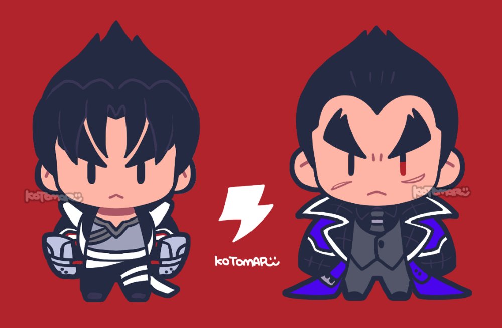 2boys arms_at_sides black_pants black_shirt blue_coat chibi chibi_only closed_mouth coat collared_shirt commentary facial_scar father_and_child father_and_son full_body grey_jacket grey_necktie grey_pants grey_shirt heterochromia jacket kazama_jin kotomaru_(kotokoto_kottan) looking_ahead male_focus mishima_kazuya multiple_boys necktie no_nose pants parent_and_child red_background scar scar_on_cheek scar_on_face shirt short_hair signature solid_oval_eyes studded_gloves tekken thick_eyebrows untranslatable_commentary