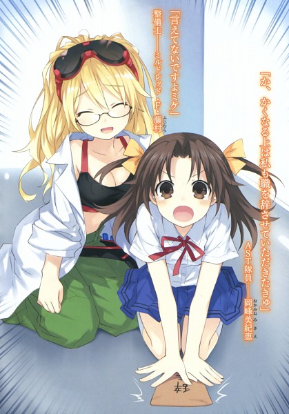 2girls bed black_bra blonde_hair blue_skirt blue_socks blush bra brown_eyes brown_hair cellphone closed_eyes date_a_live glasses green_pants long_hair looking_at_viewer mildred_f._fujimura multiple_girls official_art okamine_mikie open_clothes open_mouth open_shirt pants phone school_uniform shirt sitting skirt socks tongue underwear very_long_hair white_shirt window