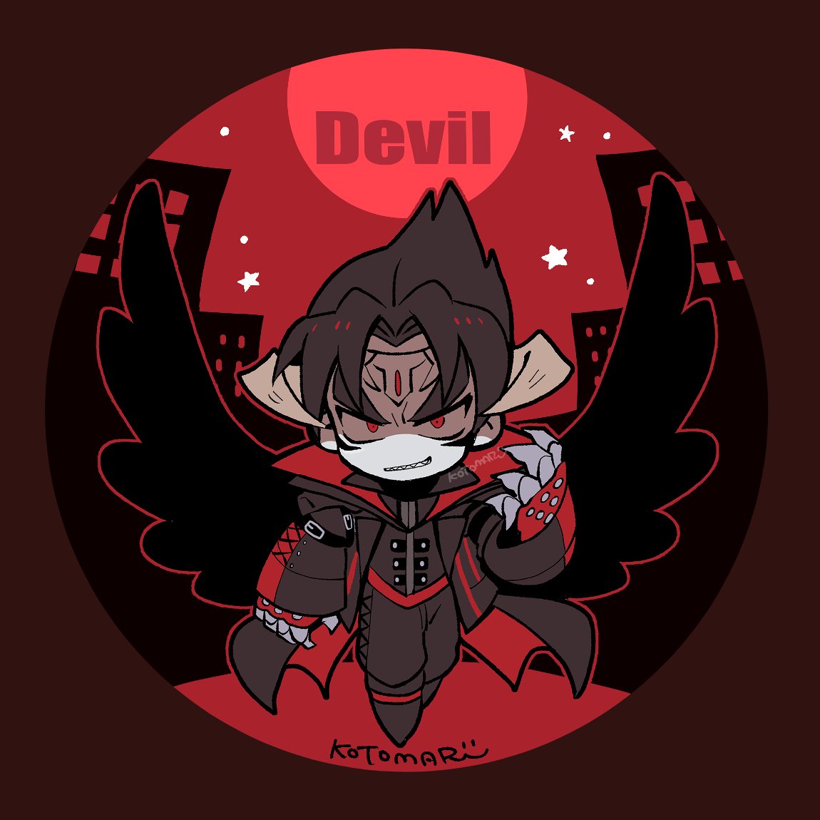 1boy arm_belt black_coat black_hair black_wings chibi chibi_only coat devil_jin forehead_jewel full_body grey_hair kazama_jin kotomaru_(kotokoto_kottan) looking_at_viewer male_focus no_nose red_eyes red_theme round_border sharp_teeth signature solo studded_gloves teeth tekken tekken_8 thick_eyebrows v-shaped_eyebrows wings