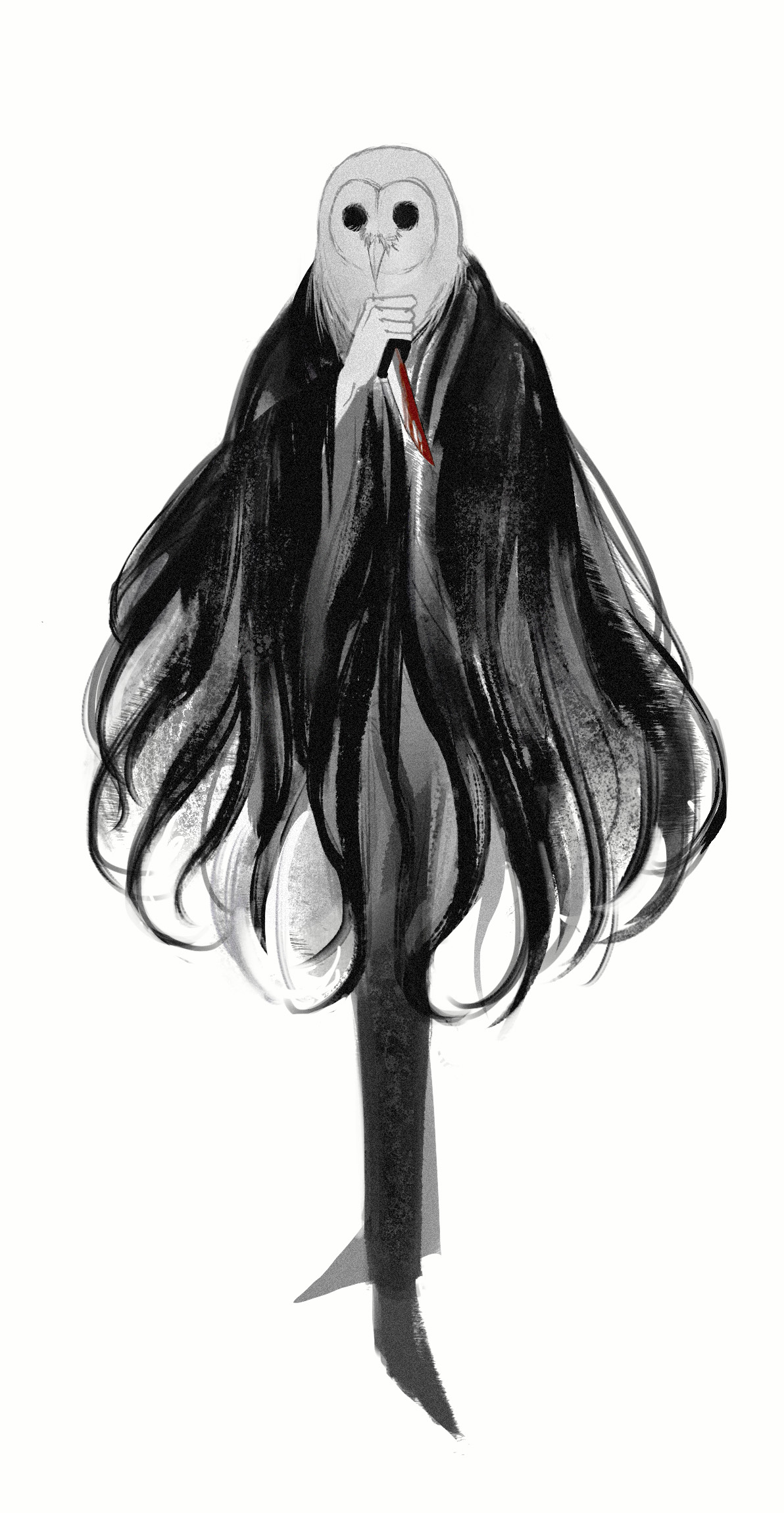 1boy animal_head bird black_cape black_pants black_shoes black_souls black_souls_2 blood bloody_weapon cape dagger full_body highres holding holding_dagger holding_knife holding_weapon knife lorde_(black_souls) owl owl_boy pants shoes simple_background sio2_(whynotkarma) solo weapon white_background