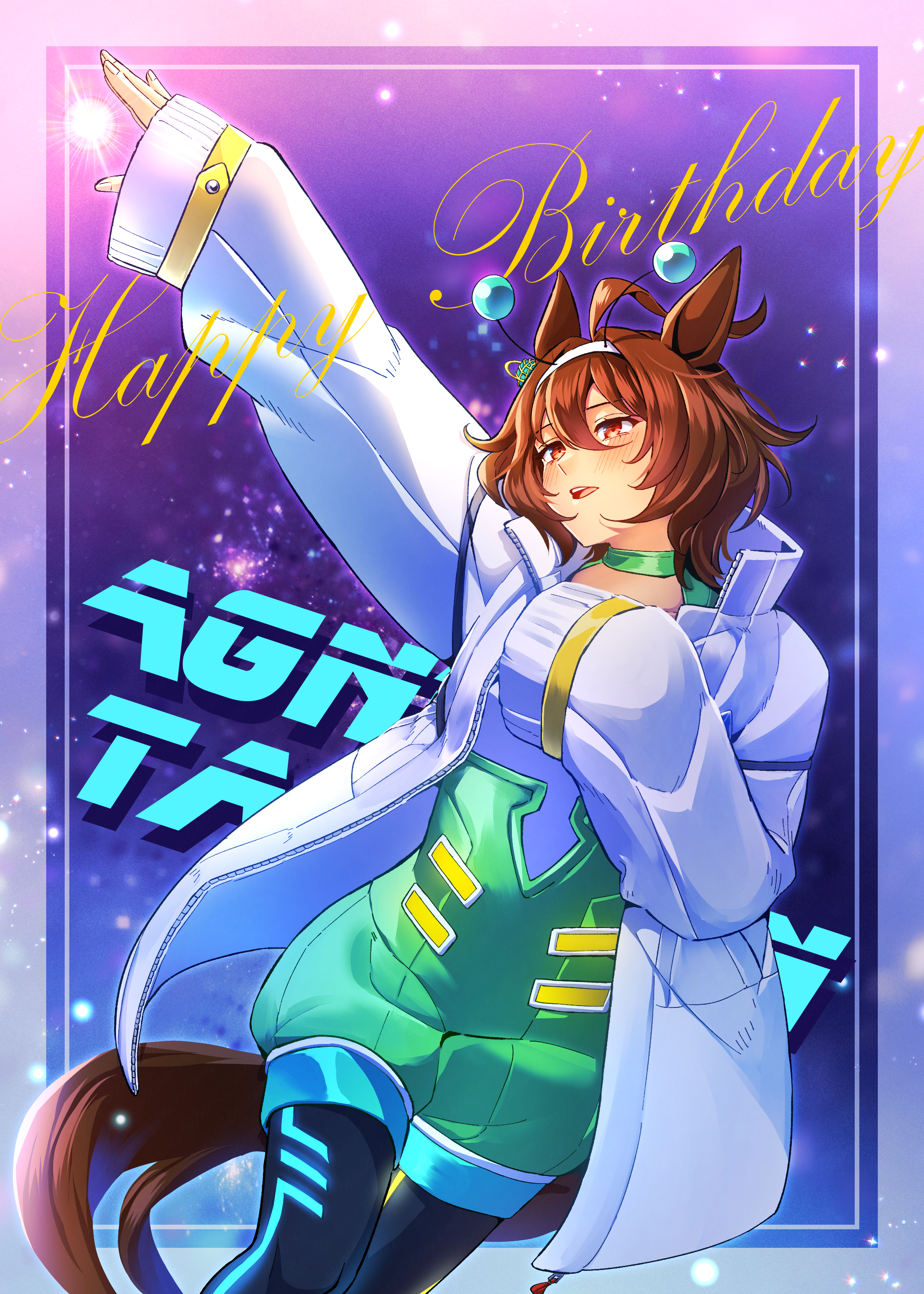 1girl absurdres agnes_tachyon_(umamusume) ahoge animal_ears brown_hair character_name commentary_request earrings gaman green_shirt hair_between_eyes hair_ornament hairband happy_birthday highres horse_ears horse_girl horse_tail jacket jewelry long_sleeves looking_at_viewer official_alternate_costume open_clothes open_jacket open_mouth pantyhose planet_hair_ornament red_eyes shirt short_hair single_earring sleeves_past_fingers sleeves_past_wrists smile solo star_(symbol) star_symbol_background tail uma_stars_(umamusume) umamusume upper_body white_hairband white_jacket