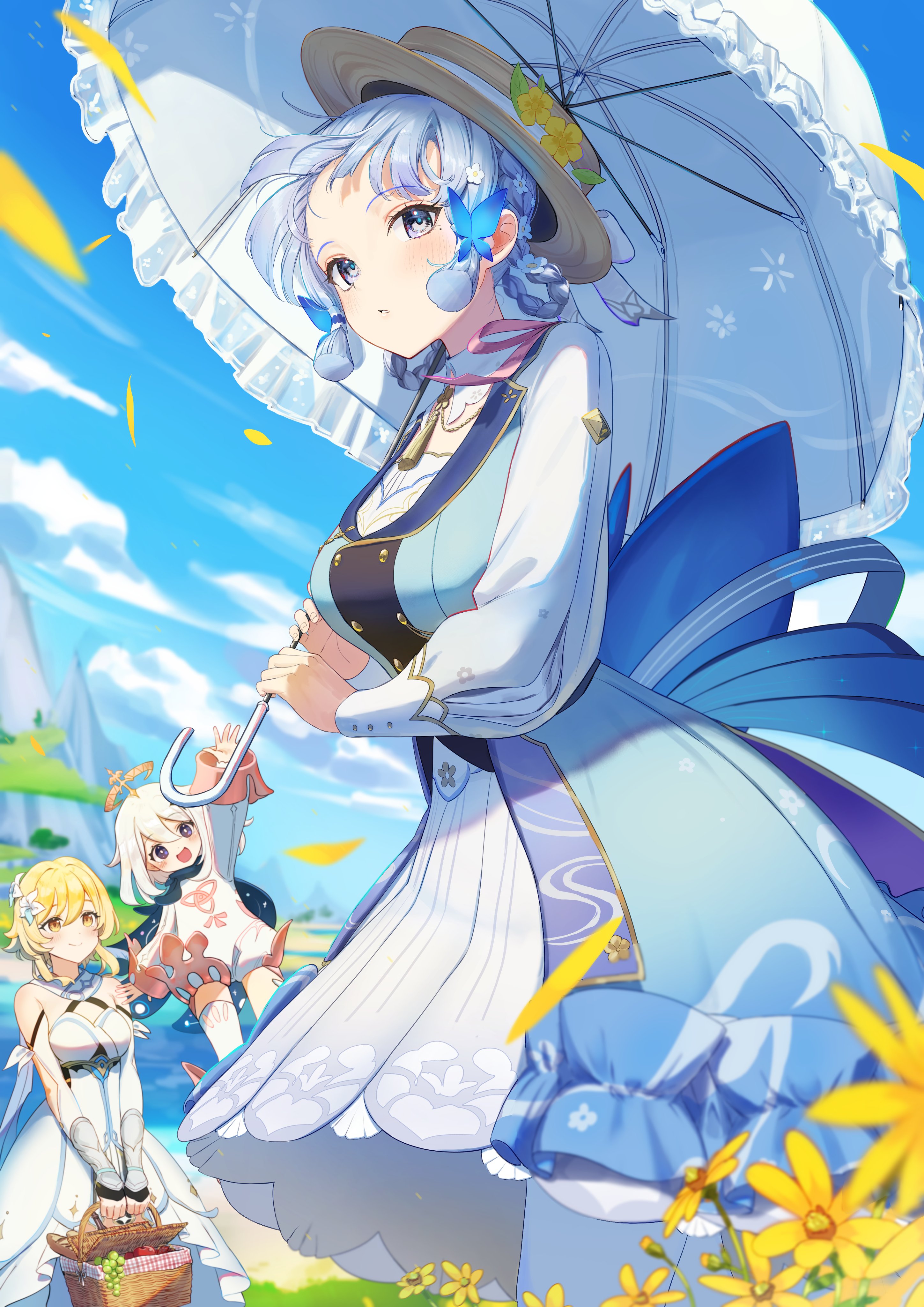 3girls absurdres ayaka_(genshin_impact) blonde_hair blue_dress blue_eyes blue_hair blunt_bangs braid breasts butterfly_hair_ornament dress flower genshin_impact hair_flower hair_ornament halo hat highres holding holding_umbrella kamisato_ayaka kamisato_ayaka_(springbloom_missive) light_blue_hair long_sleeves looking_at_viewer lumine_(genshin_impact) medium_breasts mole mole_under_eye multicolored_dress multiple_girls naruse_u official_alternate_costume official_alternate_hairstyle open_mouth paimon_(genshin_impact) puffy_long_sleeves puffy_sleeves short_hair_with_long_locks smile solo_focus umbrella white_dress white_hair yellow_eyes