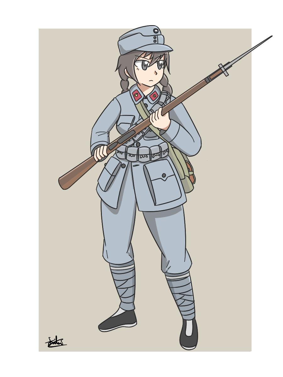 1girl ammunition_pouch artist_name bag bayonet beige_background black_eyes black_hair boots braided_pigtails breast_pocket breasts gun hat highres holding holding_rifle holding_weapon kuomintang looking_to_the_side military military_hat national_revolutionary_army original phenol_r pocket pouch rifle weapon white_sun