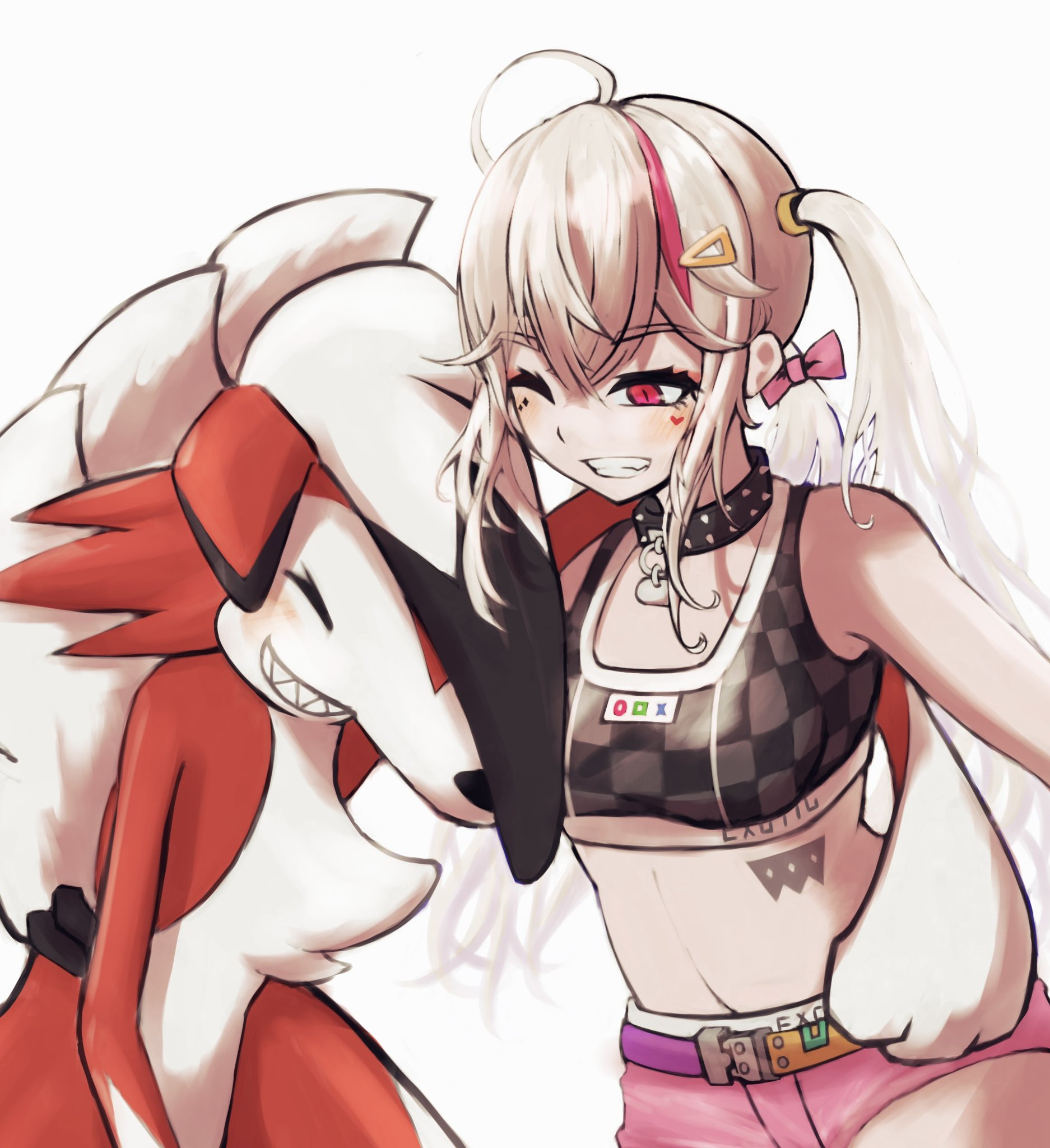1girl black_collar black_sports_bra blonde_hair breasts collar eri_aki0827 facial_tattoo gen_7_pokemon goddess_of_victory:_nikke gradient_hair grin hair_between_eyes hair_ornament hair_ribbon hairclip heart heart_tattoo highres jackal_(nikke) long_hair low_twintails lycanroc medium_breasts multicolored_hair nintendo one_eye_closed pink_hair pink_ribbon pink_shorts pokemon red_eyes ribbon shorts side_ponytail sidelocks smile spiked_collar spikes sports_bra stomach_tattoo streaked_hair tattoo twintails