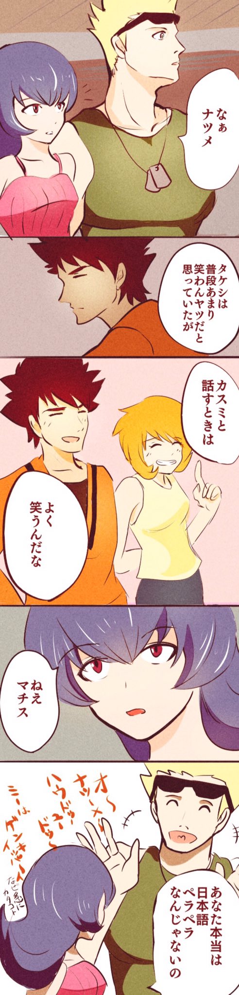 2boys 2girls black_hair blonde_hair brock_(pokemon) brown_hair comic dog_tags gym_leader highres long_hair long_image misty_(pokemon) multiple_boys multiple_girls nintendo panels pokemon pokemon_hgss purple_hair red_eyes red_hair sabrina_(pokemon) short_hair smile lt._surge tall_image tank_top translation_request v