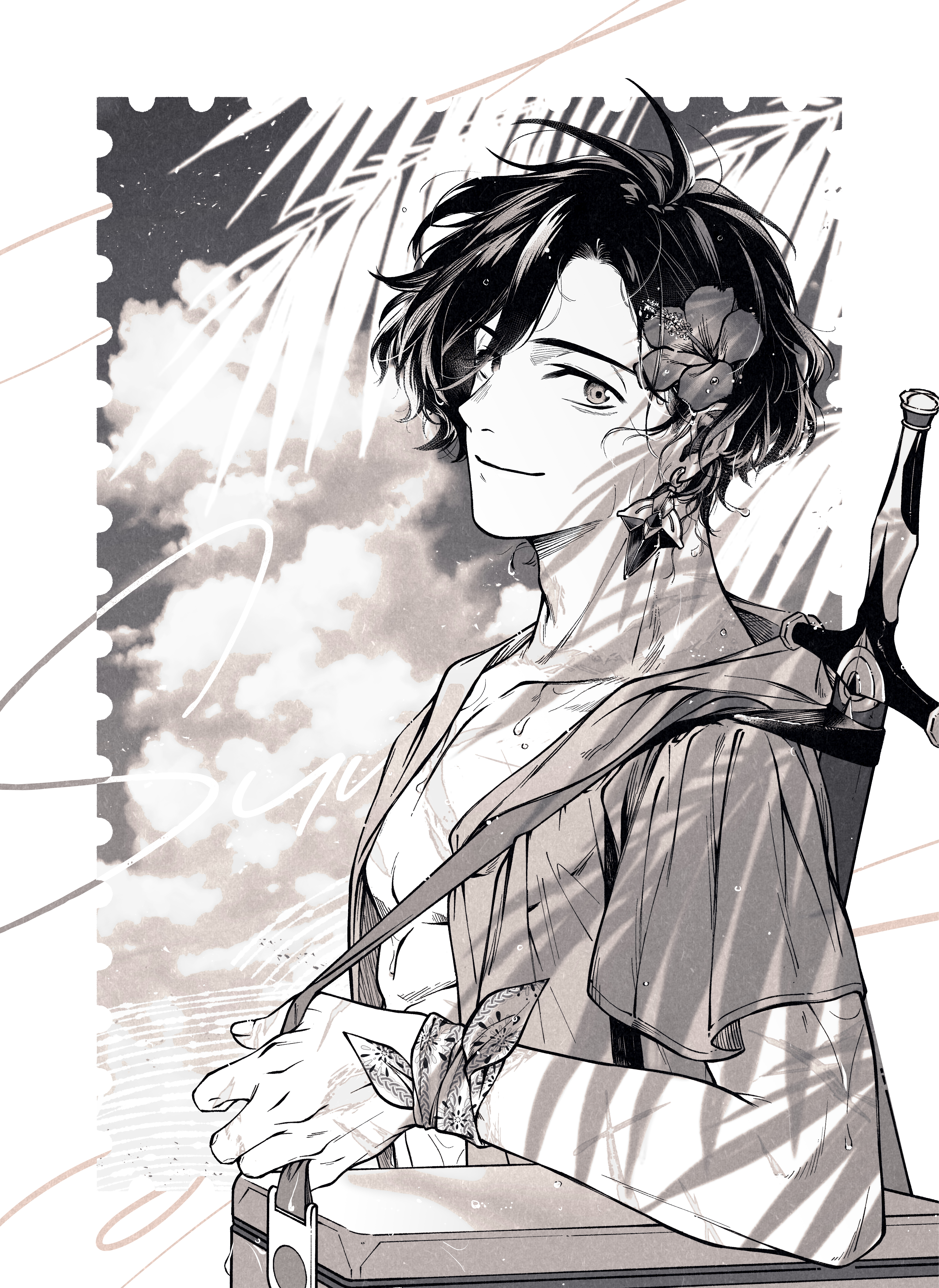 1boy absurdres adam's_apple bandana_around_arm border closed_mouth cloud collarbone constantine_xi_(fate) cooler earrings fate/grand_order fate_(series) flower greyscale hibiscus highres jacket jewelry looking_at_viewer male_focus monochrome open_clothes open_jacket shooou_0104 short_hair short_sleeves smile solo sword sword_on_back weapon weapon_on_back white_border