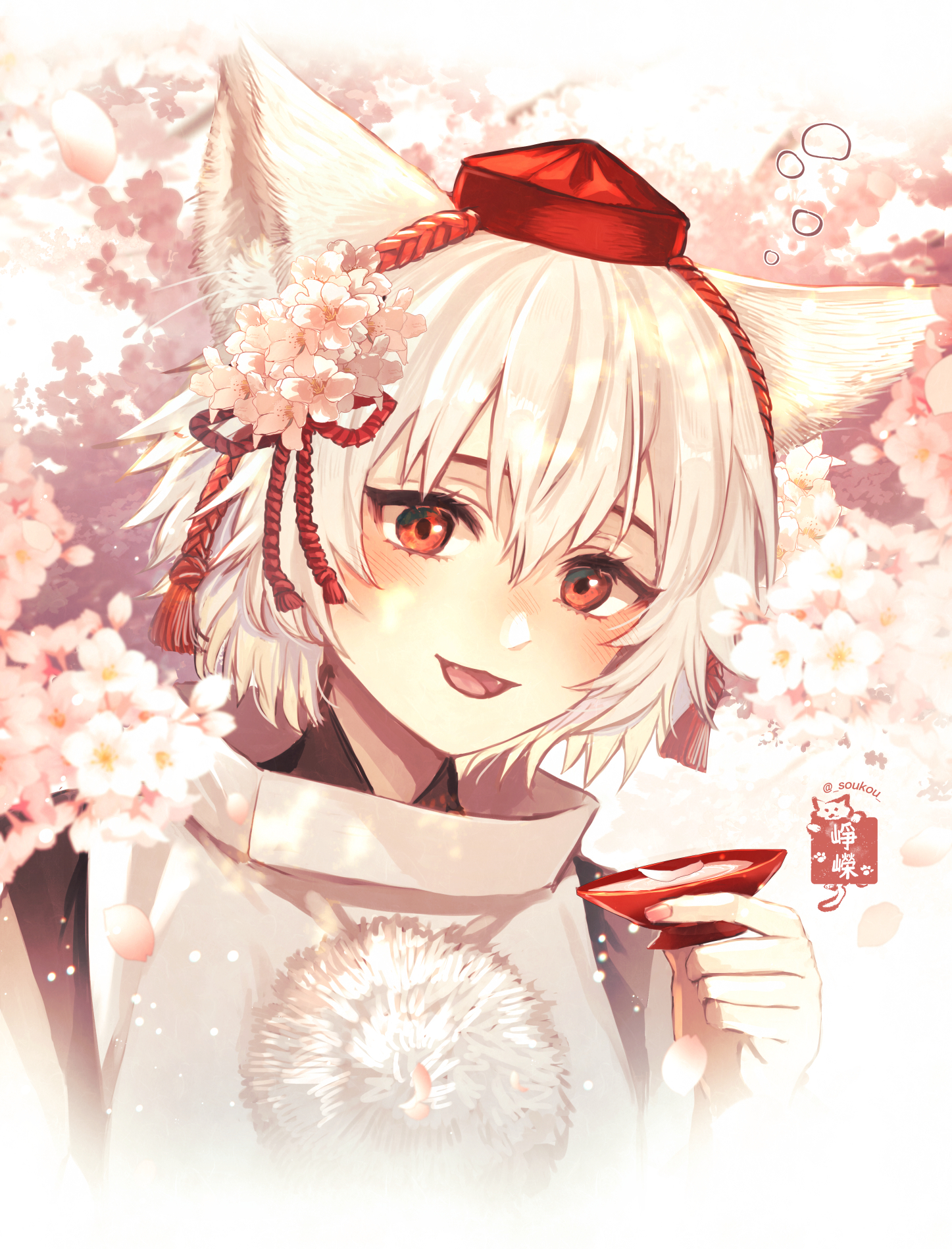 1girl animal_ears cup detached_sleeves hat head_tilt highres inubashiri_momiji parted_lips pom_pom_(clothes) red_eyes red_hat sakazuki shirt short_hair solo soukou_(sankayou) tassel tokin_hat touhou upper_body white_hair white_shirt wolf_ears wolf_girl