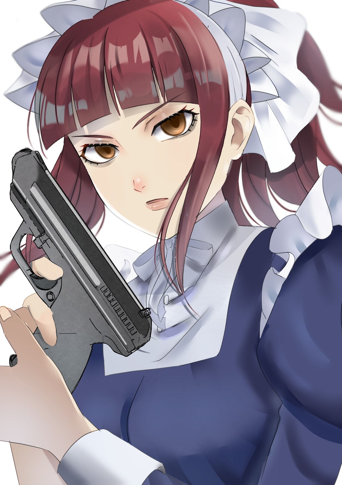 1girl black_dress blunt_bangs dress gun handgun highres holding holding_gun holding_weapon kuroshitsuji looking_at_viewer maid maid_headdress maimaiko meirin_(kuroshitsuji) no_eyewear open_mouth serious short_twintails sidelocks simple_background solo twintails upper_body weapon white_background yellow_eyes