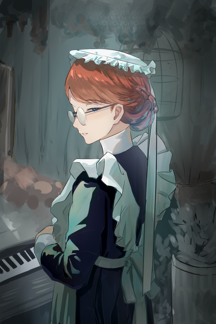 1girl birdcage black_dress braid brown_hair cage column dress glasses grey_background indoors instrument long_sleeves looking_at_viewer looking_back maid original piano pillar short_hair solo standing unfinished xiaoming_(pixiv_19522187)