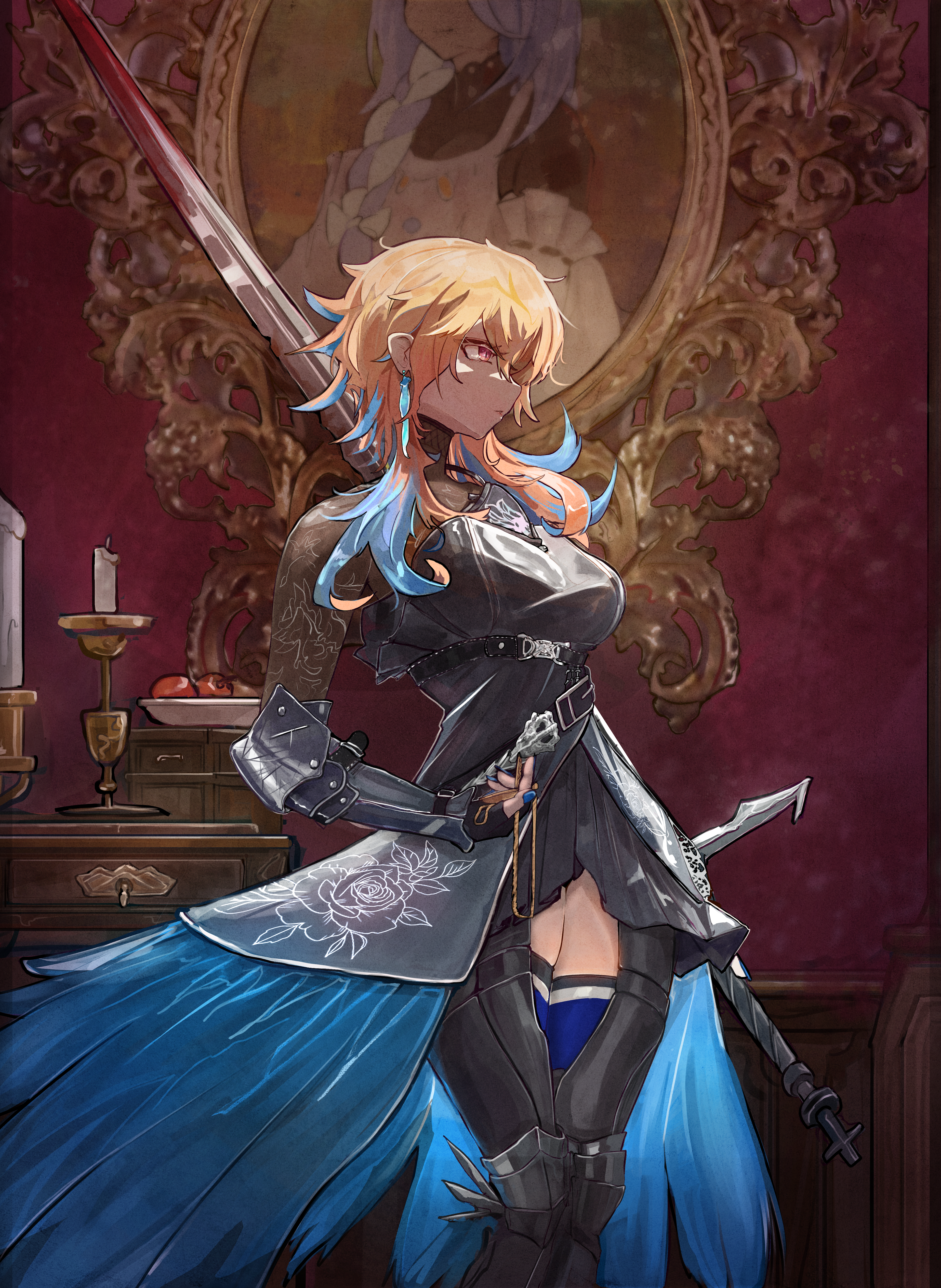 1girl absurdres armor belt blue_hair earrings feather_earrings feathers fingerless_gloves gauntlets gloves highres hololive hololive_english jewelry looking_to_the_side messy_hair multicolored_hair nereb_72 official_alternate_costume orange_hair pekomama portrait_(object) purple_eyes solo sword takanashi_kiara takanashi_kiara_(knight) virtual_youtuber weapon