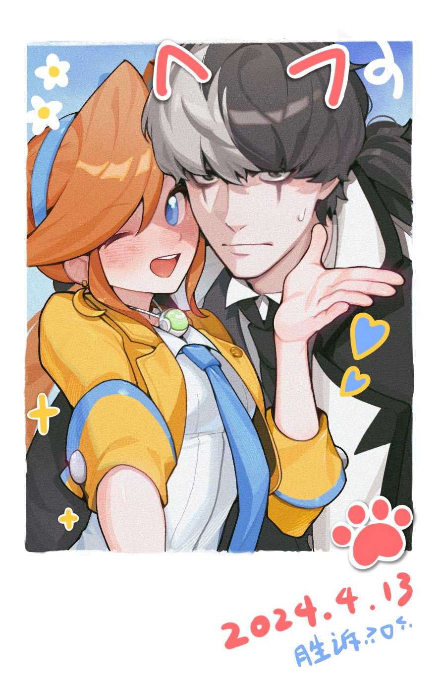 1boy 1girl :d ace_attorney athena_cykes bags_under_eyes black_hair black_jacket black_necktie blue_background blue_eyes blue_hairband blue_necktie blush brown_eyes collared_shirt dated earrings expressionless film_grain flower_sticker hairband hashtag-only_commentary heart heart_sticker highres jacket jewelry long_hair multicolored_hair necktie one_eye_closed open_clothes open_jacket open_mouth orange_hair phoenix_wright:_ace_attorney_-_dual_destinies ponytail purikura salted_whale selfie shirt sidelocks simon_blackquill single_earring sleeves_rolled_up smile sticker sweatdrop two-tone_hair white_background white_hair white_shirt yellow_jacket