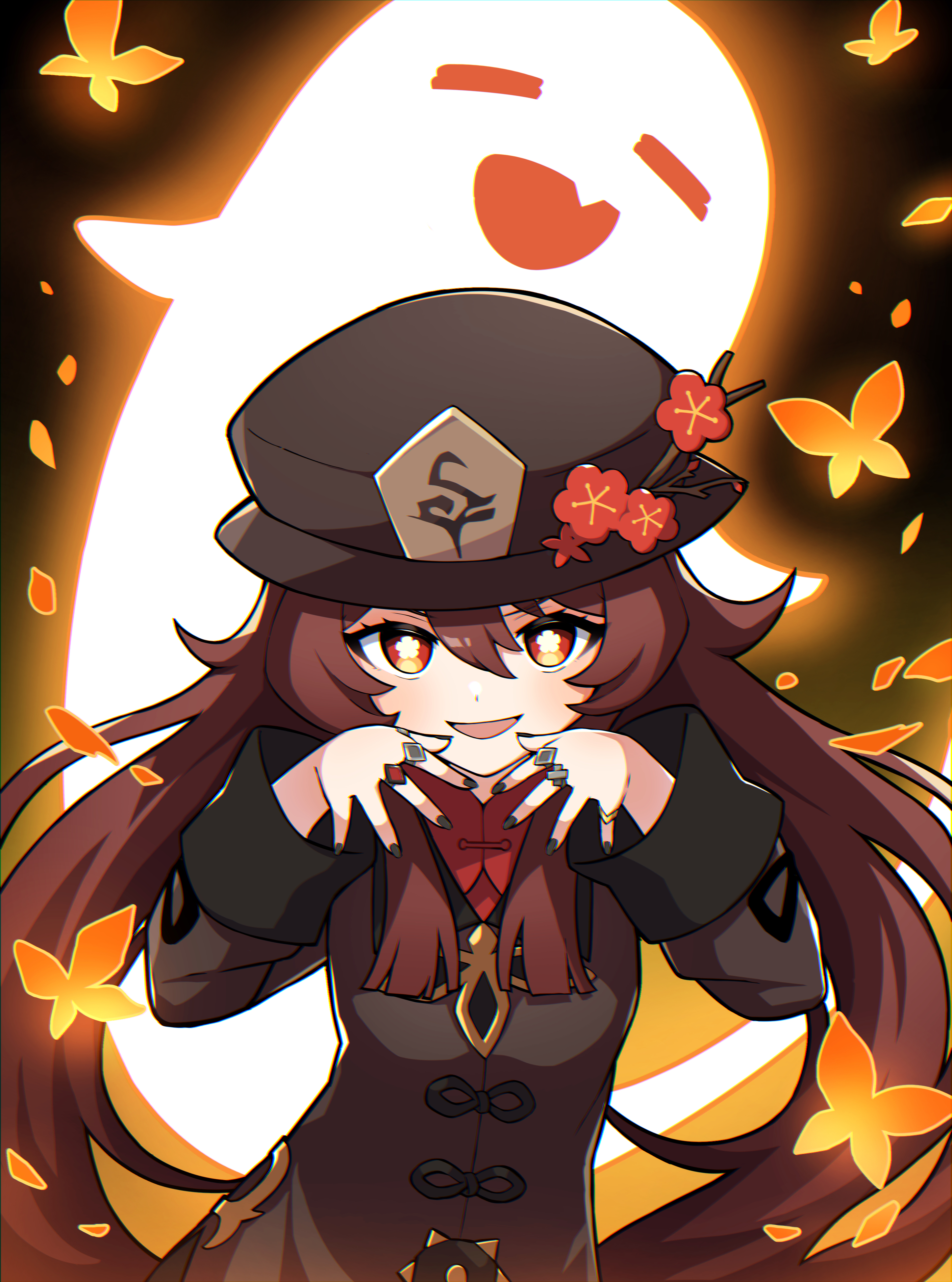 absurdres black_nails boo_tao_(genshin_impact) bright_pupils brown_eyes brown_hair brown_shirt chromatic_aberration fingernails floating_hair flower flower-shaped_pupils genshin_impact ghost glowing hair_between_eyes hands_up hat hat_flower highres hu_tao_(genshin_impact) jewelry long_hair long_sleeves looking_at_viewer magic miz_(mizillustration) nail_polish open_mouth orange_eyes red_flower ring shirt sidelocks standing symbol-shaped_pupils upper_body white_pupils