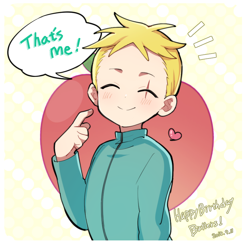 1boy blonde_hair blush butters_stotch closed_eyes commentary english_commentary english_text haizai happy_birthday jacket long_sleeves male_focus pointing pointing_at_self scar scar_across_eye scar_on_face short_hair smile solo south_park undercut