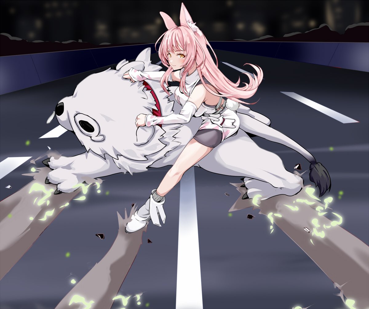 1girl akira_(manga) akira_slide animal animal_ear_fluff animal_ears bare_shoulders bike_shorts black_shorts black_sports_bra breasts detached_sleeves goddess_of_victory:_nikke hair_intakes hanchou_(shirokun555) large_breasts leona_(nikke) lion long_hair parody pink_hair shirt shorts sideless_shirt sidelocks sports_bra tail timi_(nikke) turtleneck turtleneck_shirt white_shirt yellow_eyes