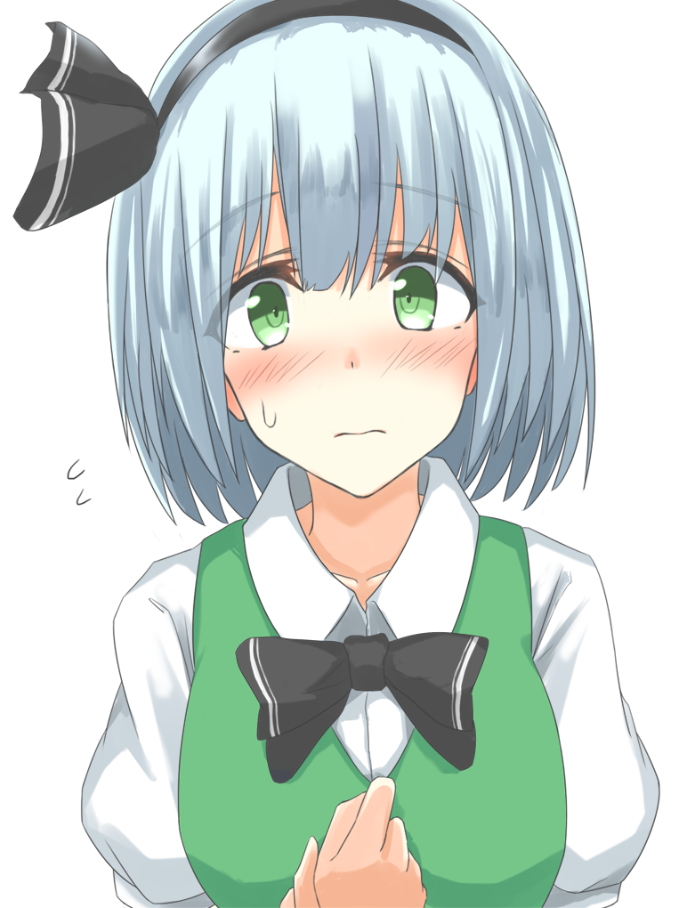 1girl black_bow black_bowtie black_hairband black_ribbon blush bow bowtie breasts collared_shirt commentary flying_sweatdrops green_eyes green_vest hair_ribbon hairband hands_on_own_breasts konpaku_youmu looking_at_viewer medium_hair own_hands_together puffy_sleeves ribbon shirt simple_background solo sweat takemitsu-zamurai touhou upper_body vest white_background white_hair white_shirt
