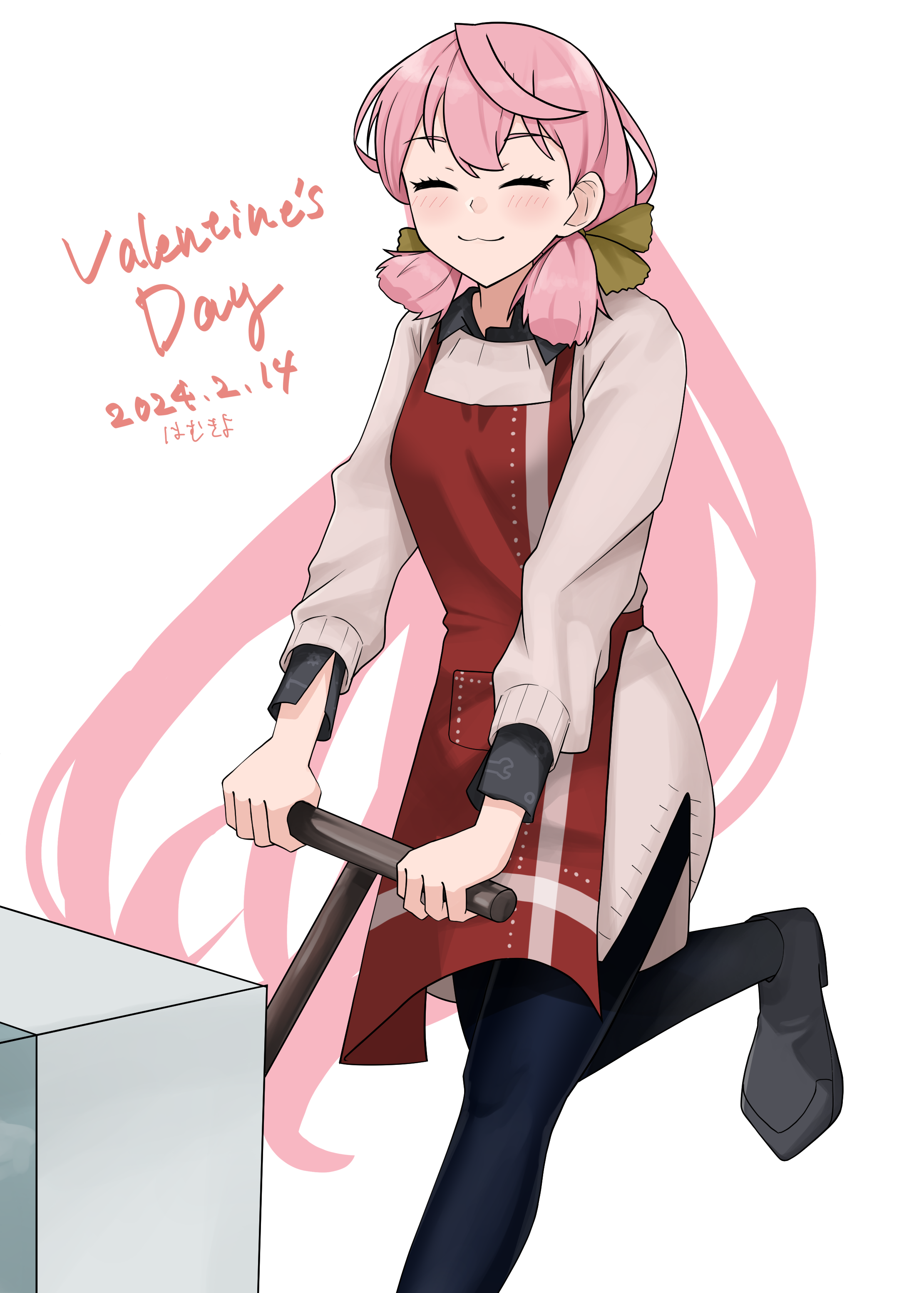 1girl 2024 absurdres akashi_(kancolle) akashi_(valentine)_(kancolle) apron black_pants cart closed_eyes dated feet_out_of_frame hair_ribbon hamukiyo highres kantai_collection kappougi long_hair pants pink_hair red_apron ribbon simple_background smile solo valentine white_background