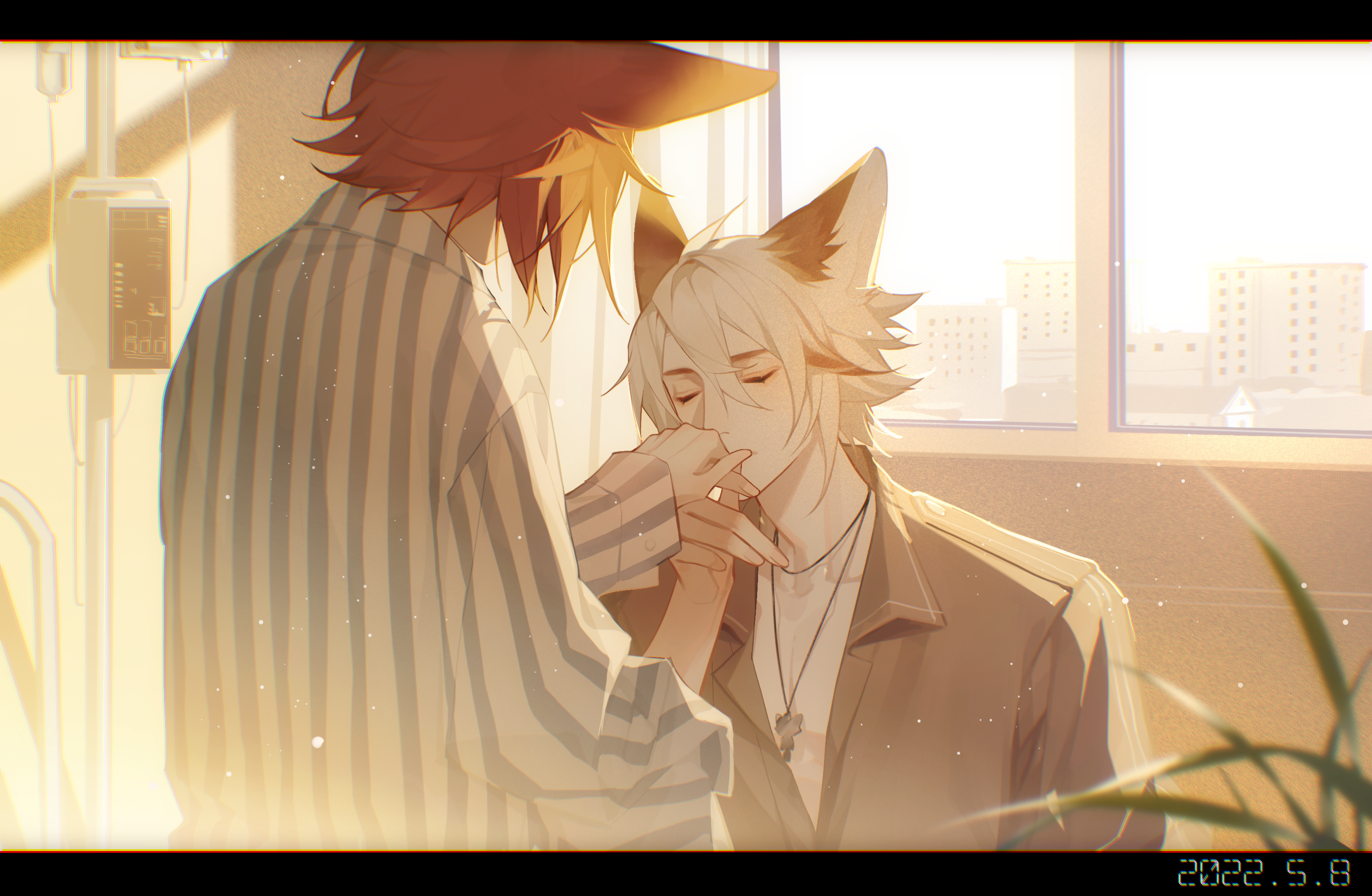 2boys animal_ears bishounen blue_shirt blue_sleeves brown_hair city closed_eyes collared_shirt colored_tips commission covered_mouth day eyelashes face-to-face fingernails fox_ears from_behind grey_shirt grey_sleeves highres indoors intravenous_drip jewelry key key_necklace kiss kissing_hand letterboxed light_particles long_sleeves male_focus multicolored_hair multiple_boys necklace original pajamas pale_skin pectoral_cleavage pectorals plant potted_plant shirt short_sleeves sky sleeves_past_wrists striped_clothes striped_shirt thick_eyebrows two-tone_shirt two-tone_sleeves upper_body vertical-striped_clothes vertical-striped_shirt white_hair white_shirt white_sky white_sleeves window yaoi zzennn