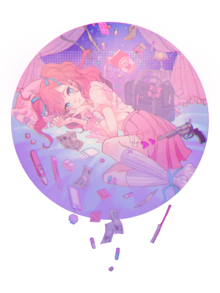 1girl bag bandaged_arm bandages banknote blue_eyes boxcutter butter_knife cellphone closed_mouth collared_shirt commentary_request dollar_bill drink feet_out_of_frame fork gauze gauze_on_leg gun handgun heart knife looking_at_viewer lying medium_skirt money nanjo_maya on_side original phone pill pink_hair pink_skirt pleated_skirt school_bag shirt skirt smartphone smile socks solo spill twintails weapon white_shirt white_socks yami_kawaii yume_kawaii