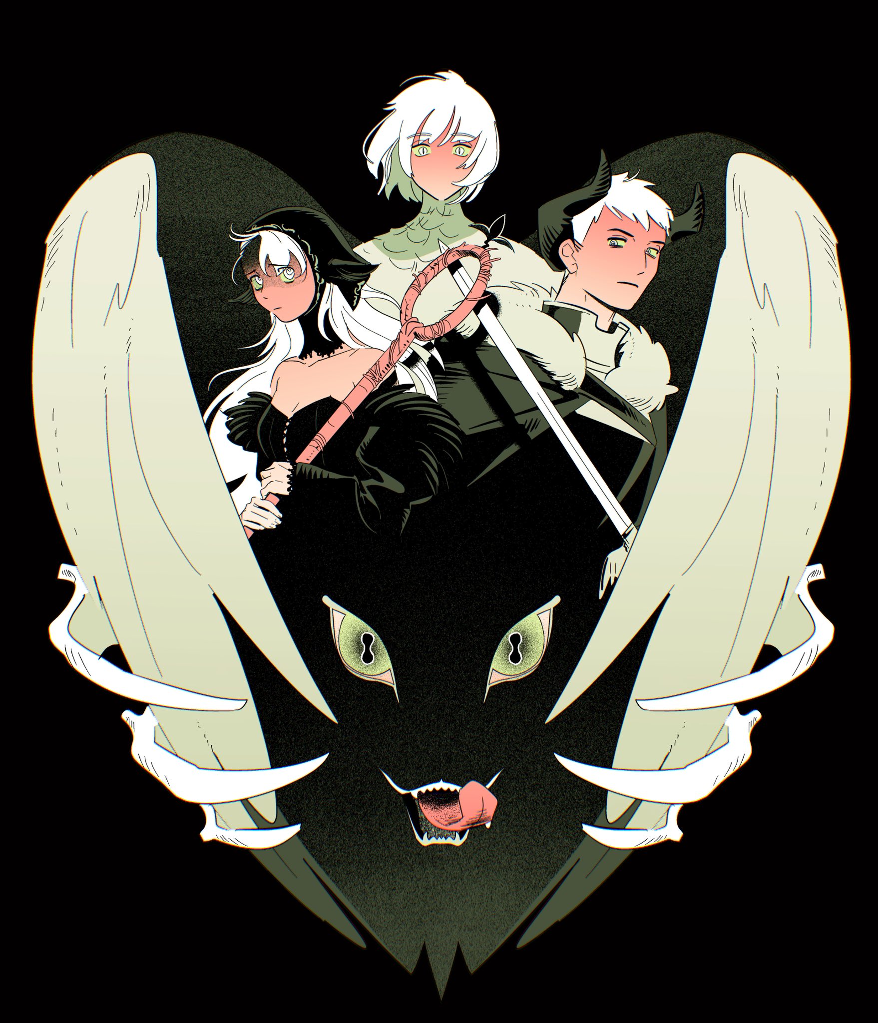 black_background black_dress black_hood cat claws colored_sclera dress dungeon_meshi falin_touden falin_touden_(chimera) green_eyes green_sclera highres horns laios_touden laios_touden_(demon_king) long_hair marcille_donato marcille_donato_(lord) robodumpling short_hair tongue very_short_hair white_hair wings