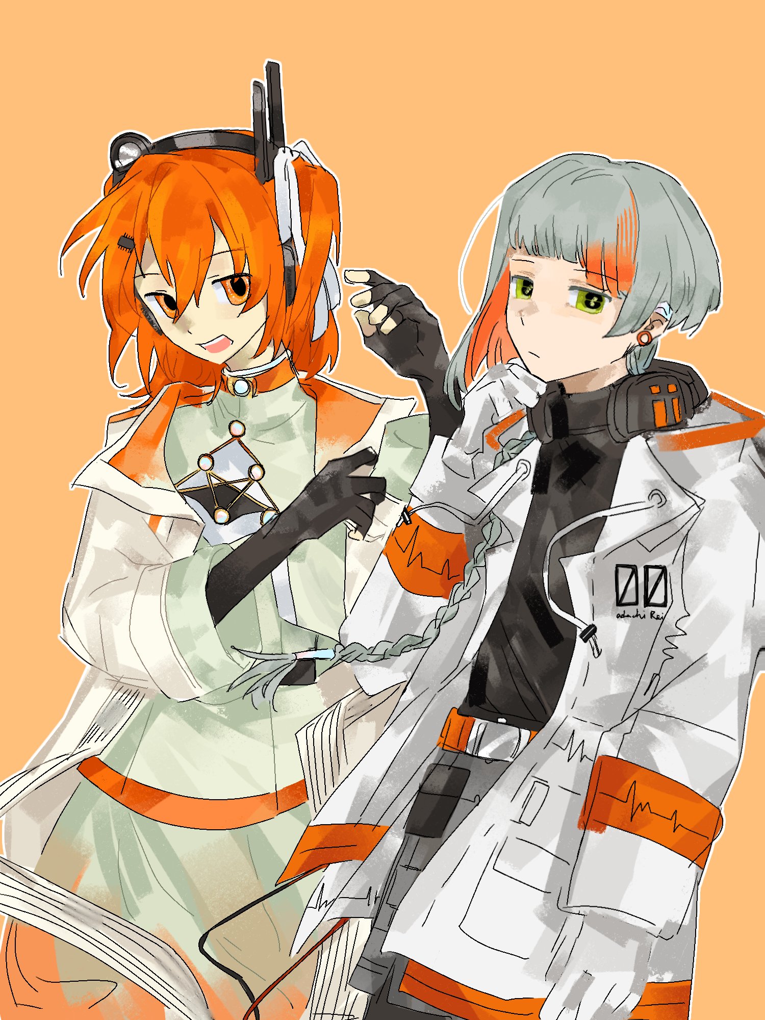 2girls a.i._voice adachi_rei adachi_rei_(cosplay) adjusting_sleeves belt black_gloves black_shirt blunt_bangs braid braided_ponytail chis-a chis-a_(cosplay) closed_mouth coat colored_inner_hair cosplay costume_switch cowboy_shot earrings expressionless gloves green_shirt green_skirt grey_hair hair_ribbon half-closed_eyes hand_on_headphones hand_up hands_up headlamp headphones headphones_around_neck highres hood hood_down hooded_jacket jacket jewelry long_hair long_skirt looking_at_viewer medium_hair multicolored_hair multiple_girls one_side_up open_clothes open_jacket open_mouth orange_background orange_belt orange_eyes outline radio_antenna ribbon shirt shirt_tucked_in side-by-side simple_background skirt smile standing turtleneck turtleneck_shirt utau voisona white_coat white_gloves white_jacket white_outline white_ribbon yosan_(yosan1130)