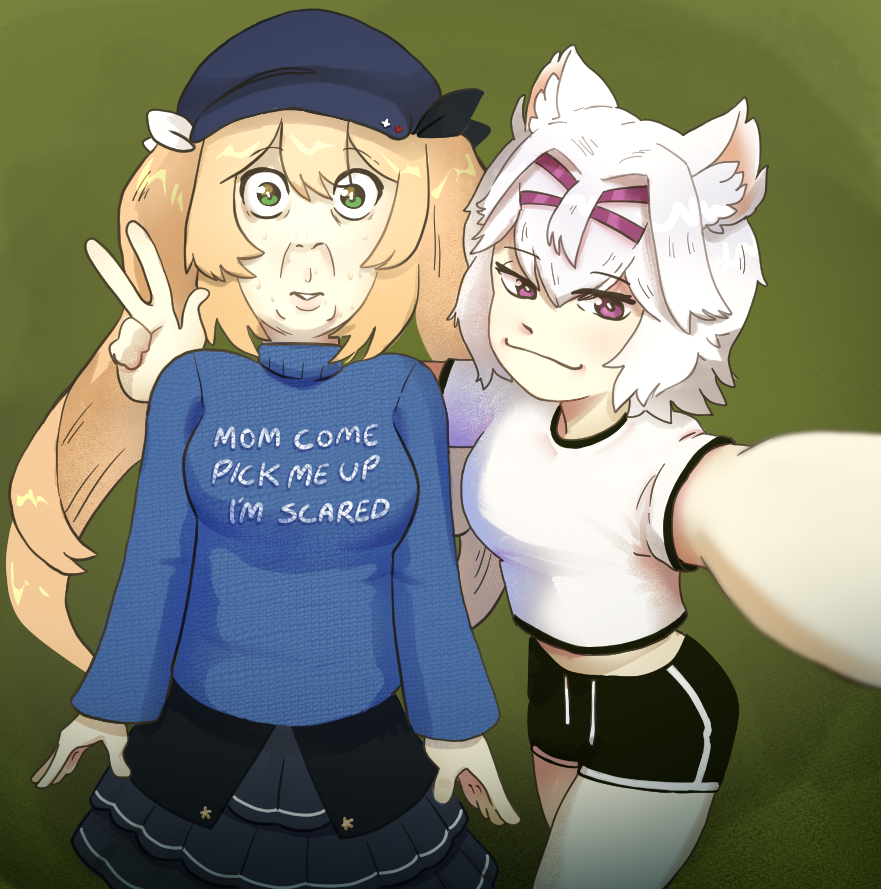 2girls animal_ears black_shorts black_skirt blonde_hair blue_hat blue_sweater breasts closed_mouth cowboy_shot dokibird dokibird_(retro_doki) english_text filian_(vtuber) green_background green_eyes hat indie_virtual_youtuber long_hair long_sleeves medium_breasts medium_hair midriff multiple_girls newbie_is_pro purple_eyes scared selfie shirt short_shorts short_sleeves shorts skirt smile sweat sweater t-shirt turtleneck turtleneck_sweater twintails v virtual_youtuber white_hair white_shirt wide-eyed