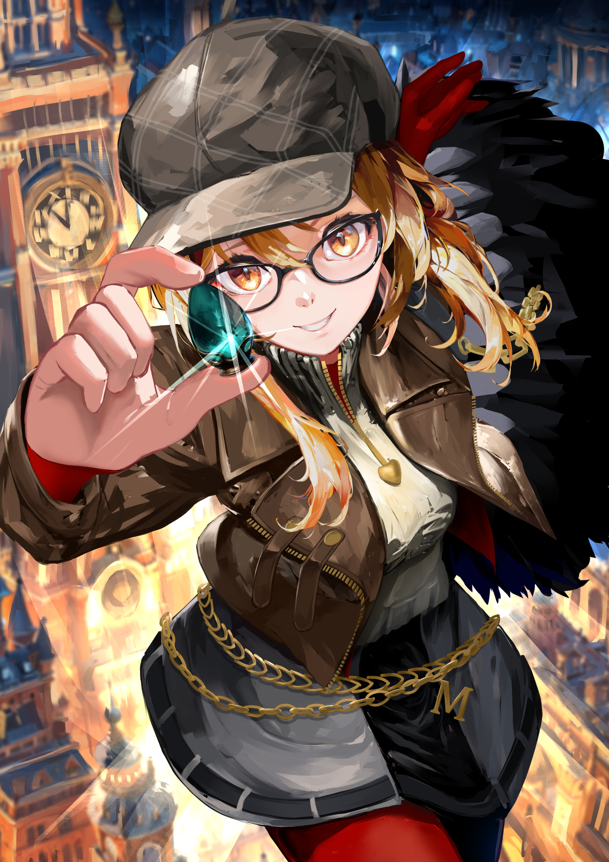 1girl aqua_gem bag black-framed_eyewear black_bag blurry blurry_background brown_eyes brown_hair brown_jacket newsboy_cap city city_lights clock clock_tower cowboy_shot european_architecture gem glasses grey_hat grey_skirt grey_sweater grin hat highres holding holding_jewelry jacket jewelry long_hair long_sleeves looking_at_viewer melania_(reverse:1999) miniskirt ms._acey night open_clothes open_jacket outstretched_arm pantyhose ponytail red_pantyhose reverse:1999 shimada_toa shoulder_bag skirt smile solo sweater teeth tower turtleneck turtleneck_sweater