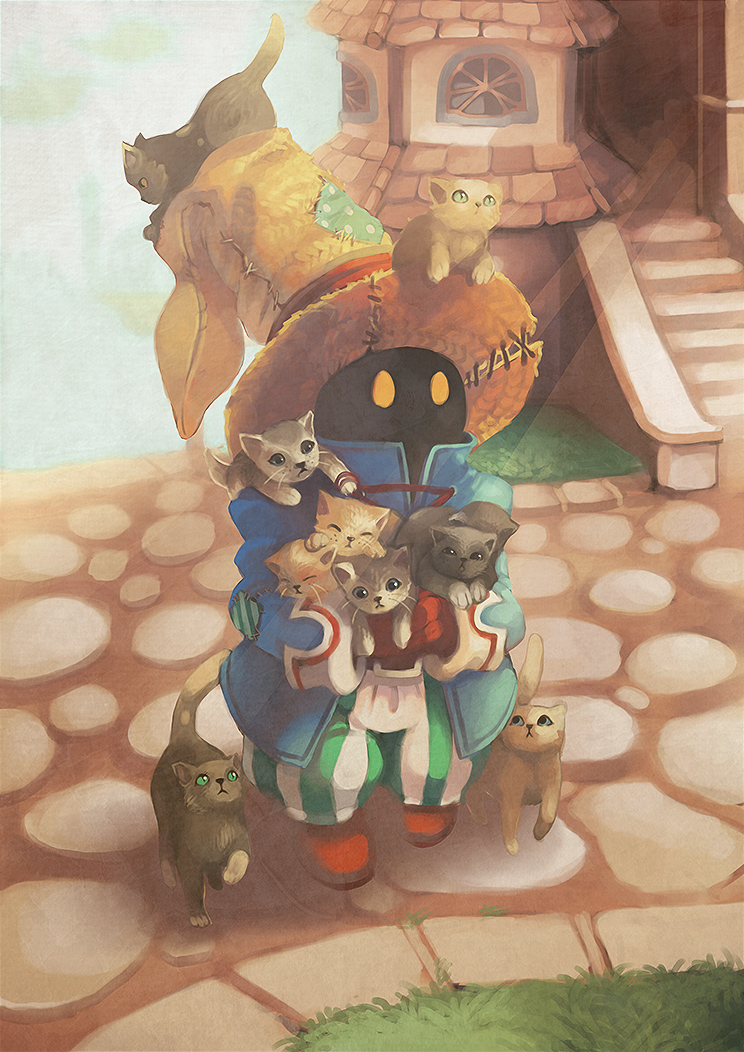 animal animal_focus black_cat black_eyes black_mage_(final_fantasy) brick_road cat commentary english_commentary final_fantasy final_fantasy_ix full_body gloves green_eyes hat holding holding_animal holding_cat house junkdoesart long_sleeves pants solid_oval_eyes stairs standing striped_clothes striped_pants too_many too_many_cats vertical-striped_clothes vertical-striped_pants vivi_ornitier white_cat witch_hat yellow_eyes