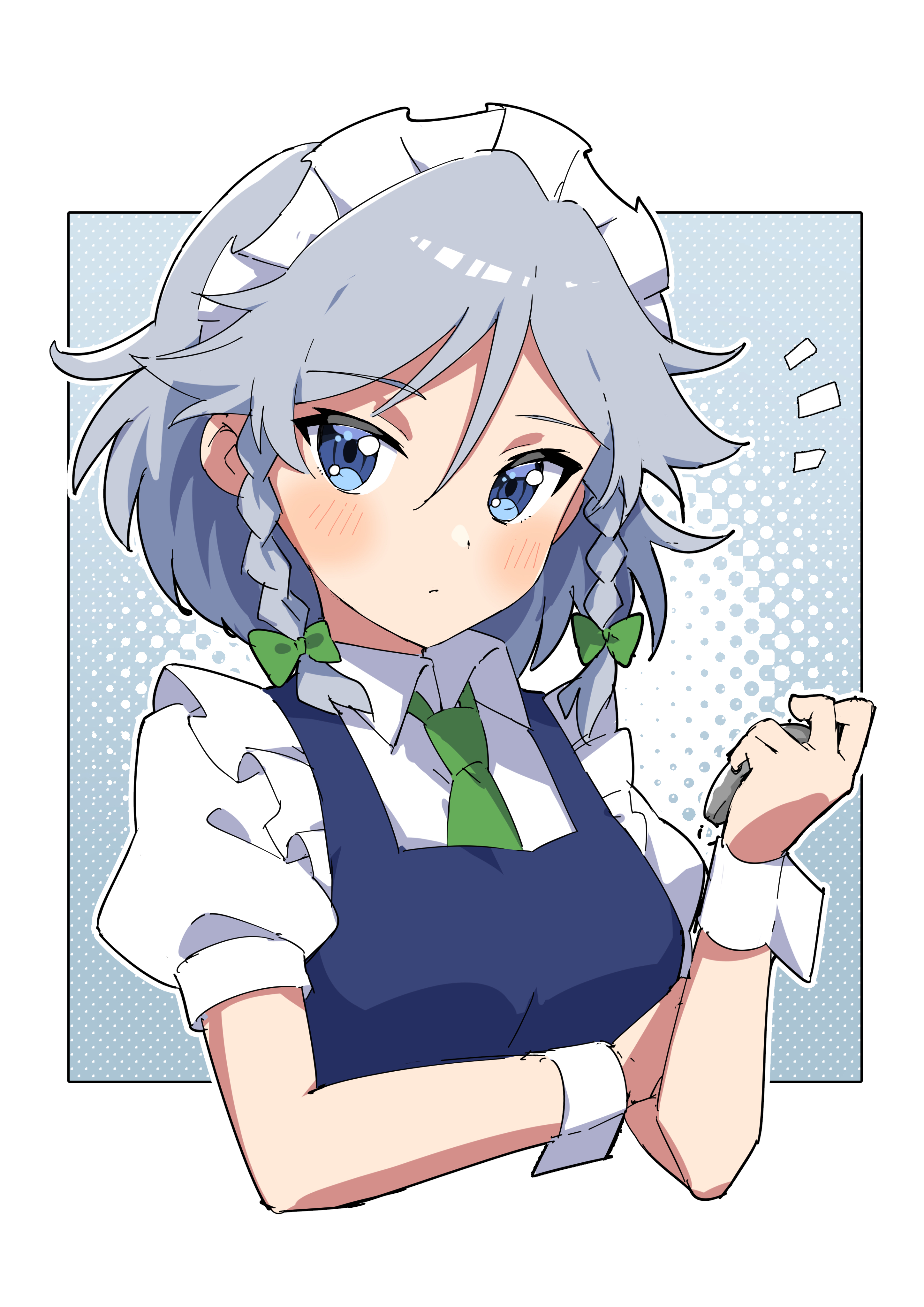 1girl absurdres blue_eyes border bow braid collared_shirt green_bow green_necktie grey_hair hair_between_eyes hair_bow highres izayoi_sakuya maid maid_headdress medium_hair miz_(mizillustration) necktie notice_lines pocket_watch puffy_short_sleeves puffy_sleeves shirt short_hair short_sleeves solo touhou twin_braids upper_body vest watch white_border white_shirt wrist_cuffs