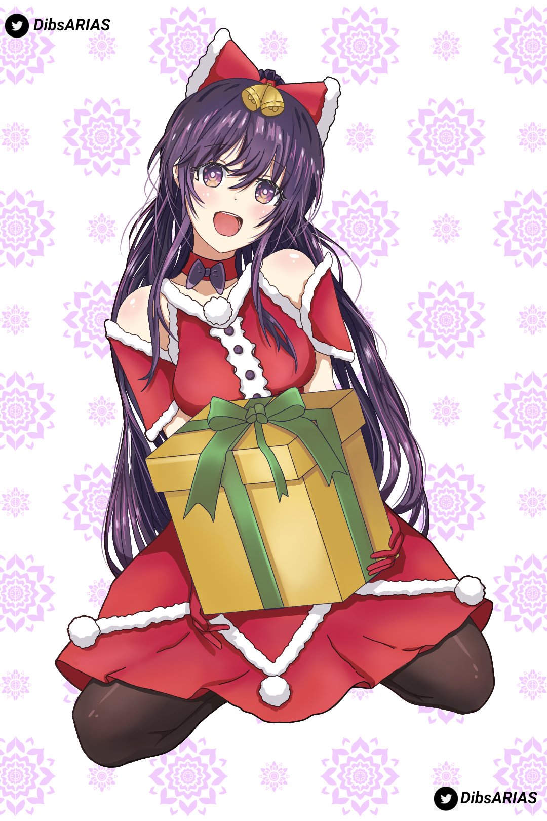 1girl aqualeb blush christmas_present date_a_live gift highres pantyhose purple_eyes purple_hair santa_costume solo yatogami_tohka