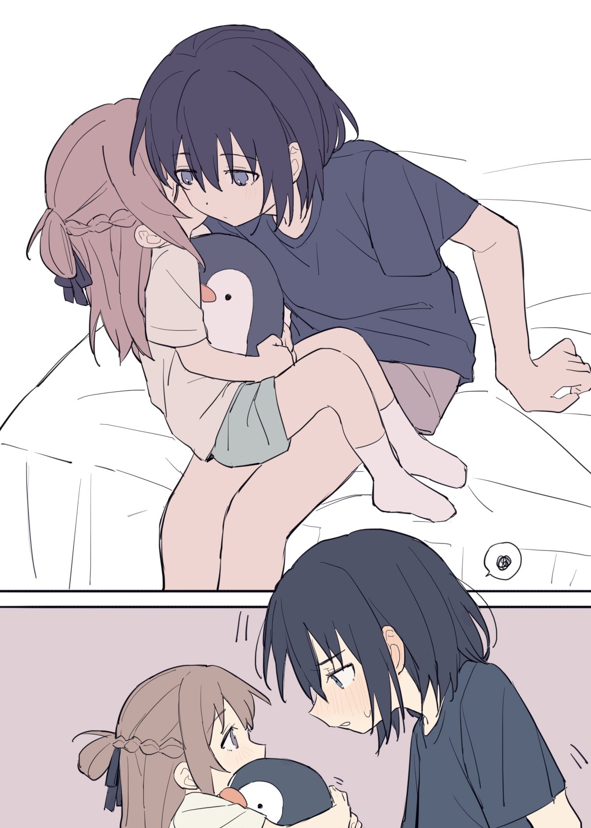 2girls aged_down black_hair black_shirt blue_eyes braid brown_hair child coldcat. commission french_braid green_shorts grey_shirt highres long_hair medium_hair miyagi_shiori multiple_girls on_bed second-party_source sendai_hazuki shirt short_sleeves shorts shuuniichido_classmate_wo_kau_hanashi sitting sitting_on_lap sitting_on_person spoken_squiggle squiggle stuffed_animal stuffed_penguin stuffed_toy yuri