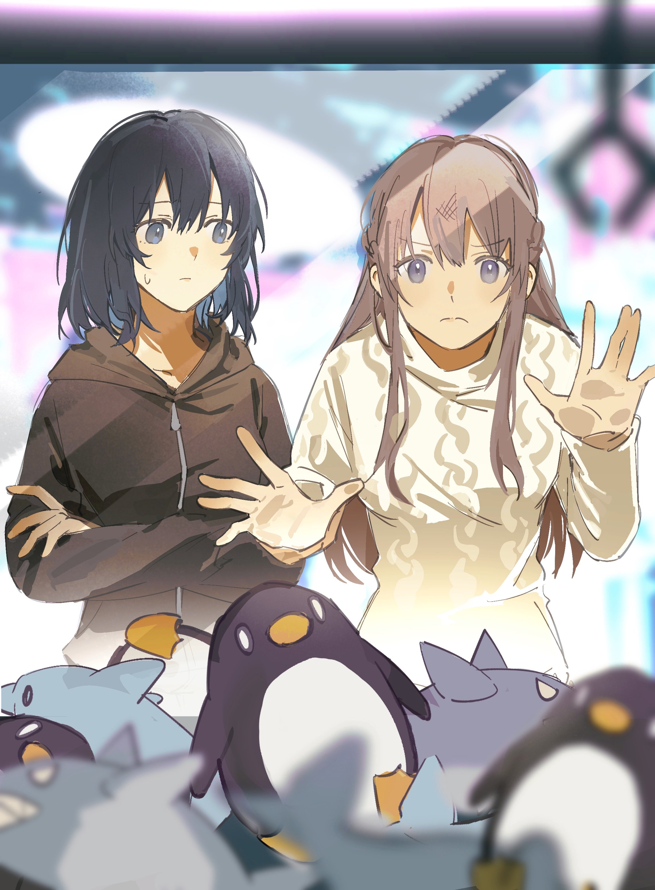 2girls absurdres aran_sweater artist_request black_hair blurry blurry_background blurry_foreground brown_hair brown_jacket cable_knit chinese_commentary closed_mouth commentary_request commission crane_game grey_eyes highres jacket long_sleeves looking_at_another looking_at_viewer medium_hair miyagi_shiori multiple_girls second-party_source sendai_hazuki shuuniichido_classmate_wo_kau_hanashi stuffed_animal stuffed_penguin stuffed_toy sweatdrop sweater white_sweater