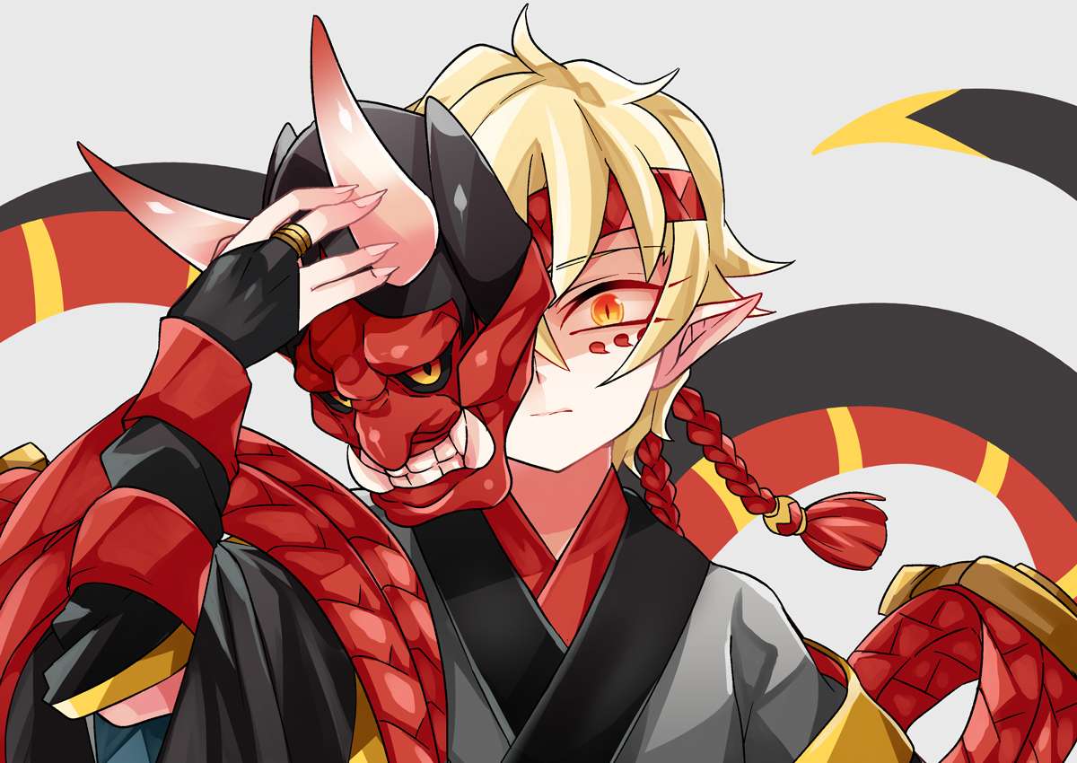 1boy bishounen black_bridal_gauntlets black_haori black_kimono black_trim blonde_hair bridal_gauntlets closed_mouth constricted_pupils eye_tattoo facial_mark facial_tattoo fingernails gold_ring grey_kimono hair_between_eyes hand_up hannya_(onmyoji) hannya_mask haori headband horned_mask japanese_clothes kimono layered_clothes layered_kimono long_sleeves looking_at_viewer male_focus mask mask_on_head mask_over_one_eye moto_mitsuashi multicolored_bridal_gauntlets multicolored_haori multicolored_kimono oni_mask onmyoji orange_eyes orange_haori orange_trim pointy_ears pom_pom_(clothes) red_bridal_gauntlets red_headband red_kimono red_mask red_rope rope rope_belt shaded_face sharp_fingernails short_hair sidelocks simple_background slit_pupils snake solo tagme tattoo tattoo_under_eye trap upper_body white_background yellow_bridal_gauntlets yellow_trim