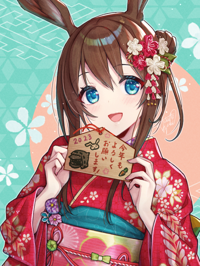 1girl 2023 amiya_(arknights) animal_ears arknights blue_eyes blush brown_hair ema flower hair_bun hair_ornament holding holding_ema japanese_clothes kanzashi kimono long_hair long_sleeves new_year obi open_mouth rabbit_ears rabbit_girl sash smile solo tokifuji_kougetsu translation_request upper_body