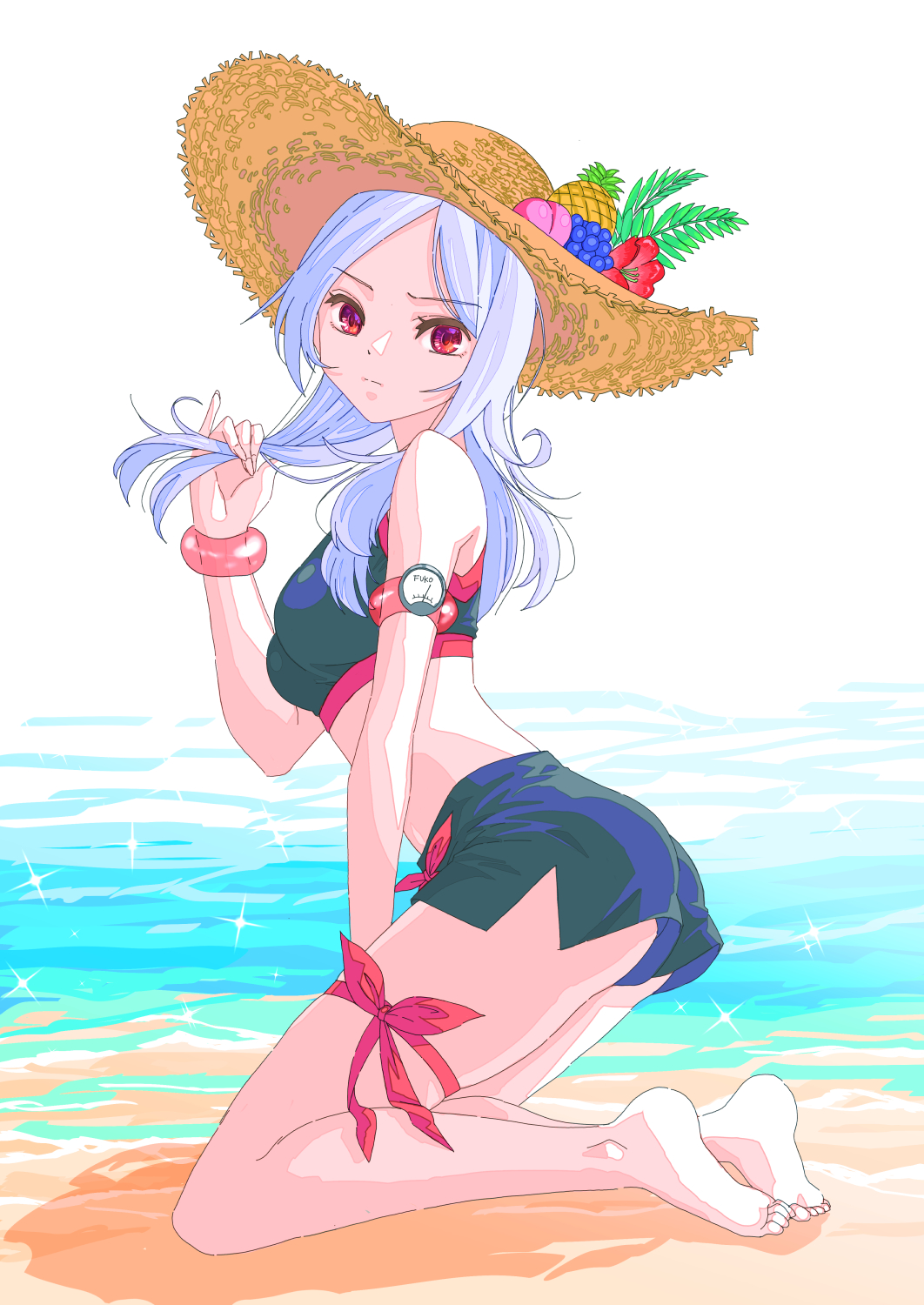 beach bikini eas_(precure) fresh_precure! grey_hair hat higashi_setsuna highres jj_(ssspulse) ocean precure red_eyes revealing_clothes ribbon shorts stomach swimsuit
