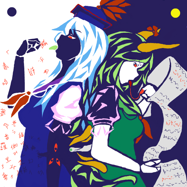 2girls blue_dress blue_hair breasts dress ex-keine from_side green_dress hat horn_ornament horns kamishirasawa_keine limited_palette medium_hair multiple_girls puffy_short_sleeves puffy_sleeves red_eyes row_(akatuki) shirt short_sleeves small_breasts touhou