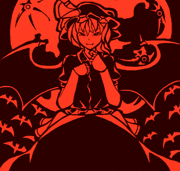 1girl back_bow bat_(animal) bat_wings bow closed_mouth collared_shirt cowboy_shot fang fang_out frilled_skirt frills full_moon hair_between_eyes hat looking_at_viewer medium_hair mob_cap monochrome moon outdoors puffy_short_sleeves puffy_sleeves red_background remilia_scarlet row_(akatuki) shirt short_sleeves simple_background skirt solo touhou wings