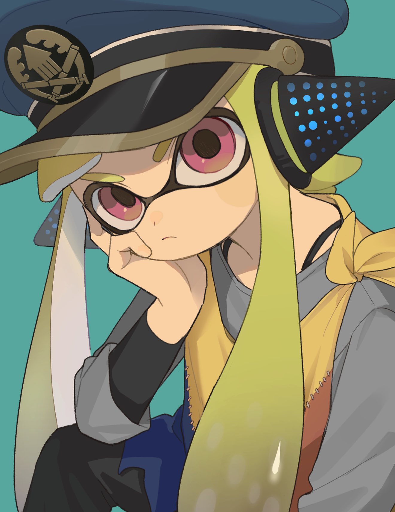 1girl agent_3_(splatoon) black_pants blue_background blue_hat blush_stickers bra_strap captain_3_(splatoon) cloak closed_mouth commentary_request frown gomi_(kaiwaresan44) green_hair grey_shirt hand_on_own_cheek hand_on_own_face hat head_rest headphones highres inkling layered_shirt long_hair long_sleeves military_hat multicolored_clothes nintendo pants peaked_cap red_eyes shirt simple_background solo splatoon_(series) splatoon_3 tentacle_hair thick_eyebrows torn_cloak torn_clothes twintails upper_body v-shaped_eyebrows