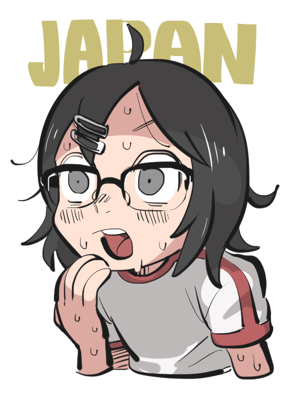 1girl black_hair blush cropped_arm cropped_torso english_text glasses grey_eyes gym_shirt hair_ornament hairclip hand_to_own_mouth hand_up looking_ahead messy_hair nervous_sweating open_mouth shirt short_hair short_sleeves simple_background solo suzuki_suzu_(urayasu_tekkin_kazoku) sweat tirarizun upper_body urayasu_tekkin_kazoku v-shaped_eyebrows white_background white_shirt wide-eyed