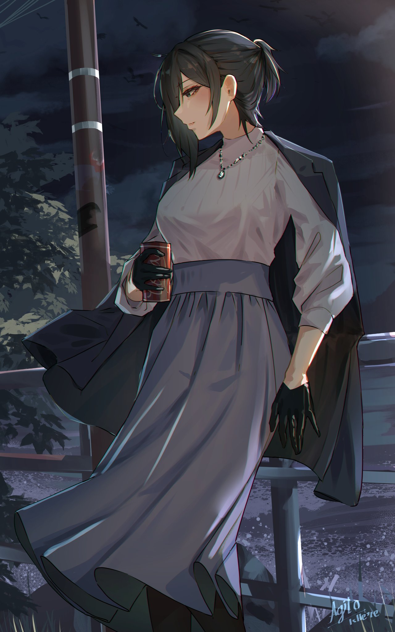 1girl against_railing agito_(agitoishere) black_hair blue_eyes blue_skirt can commentary_request grey_sweater highres holding holding_can jacket jacket_on_shoulders jewelry leaf long_skirt medium_hair necklace night original pantyhose ponytail railing sidelocks skirt sky solo standing sweater sweater_tucked_in utility_pole yokoyama_ishimi