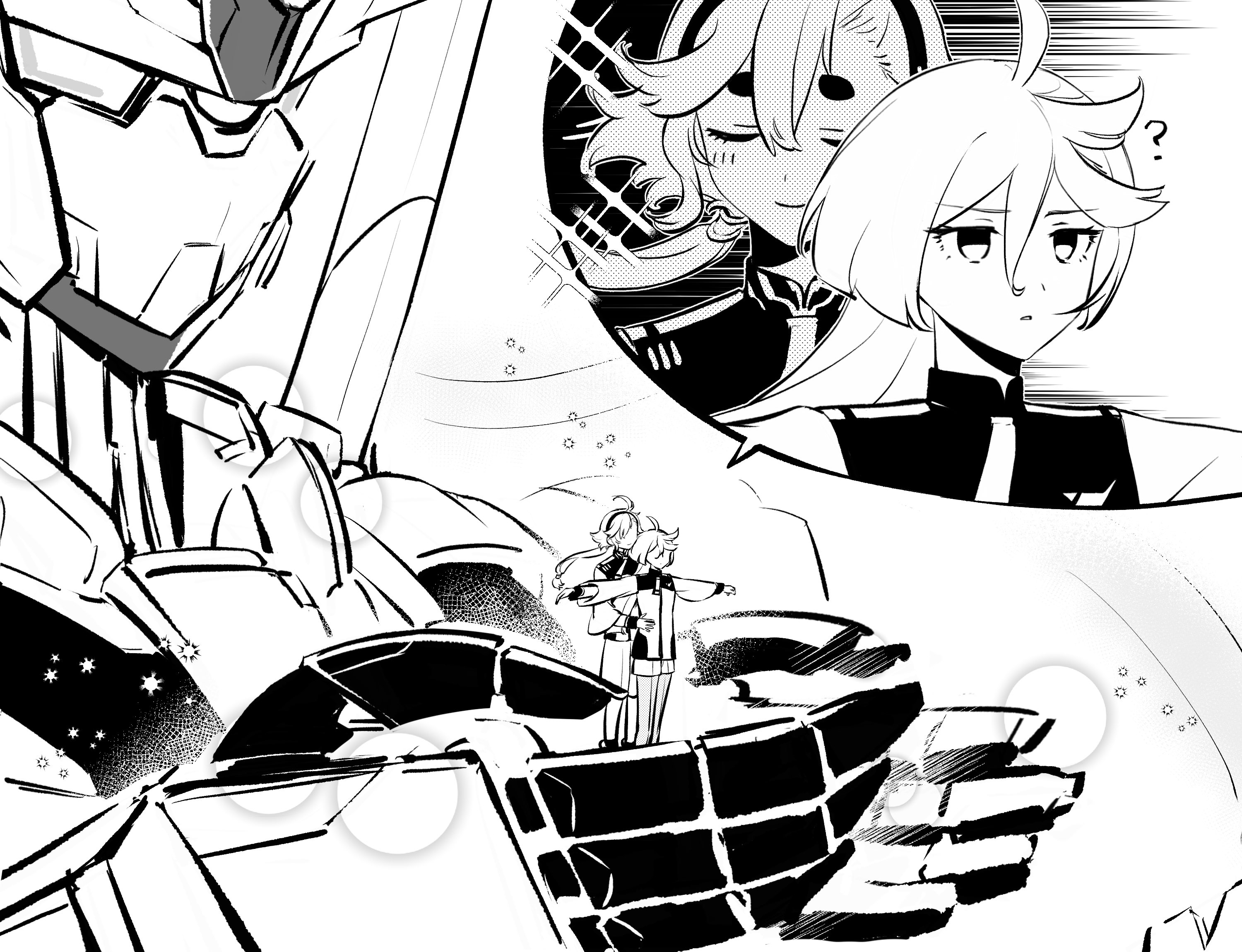 2girls ? ahoge artist_request asticassia_school_uniform chinese_commentary closed_eyes closed_mouth commentary commentary_request commission english_commentary greyscale gundam gundam_aerial gundam_suisei_no_majo hands_on_another's_waist highres long_hair miorine_rembran mixed-language_commentary monochrome multiple_girls parted_lips ponytail scene_reference school_uniform second-party_source smile sparkle suletta_mercury thick_eyebrows titanic_(movie)