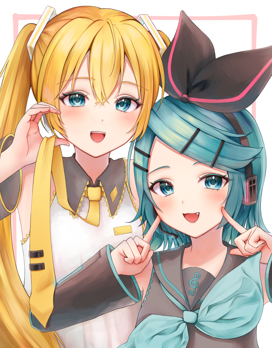 2girls :3 alternate_color aqua_eyes aqua_hair aqua_neckerchief black_collar black_sleeves blonde_hair blush bow_hairband cheek_poking collar collared_shirt color_switch detached_sleeves fang grey_sailor_collar grey_shirt hair_ornament hairband hairclip hand_up hatsune_miku headphones headset hisui_ame holding_necktie kagamine_rin long_hair long_sleeves looking_at_viewer medium_hair multiple_girls neckerchief necktie open_mouth palette_swap poking sailor_collar shirt sleeveless sleeveless_shirt smile treble_clef twintails very_long_hair vocaloid yellow_necktie