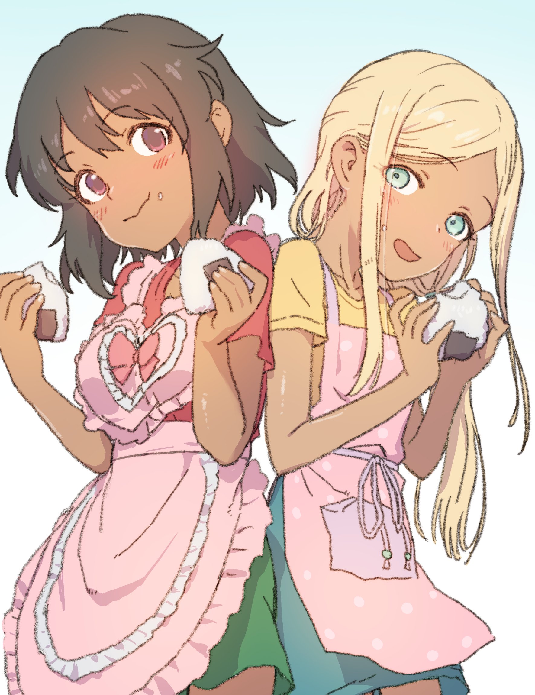 2girls apron aqua_eyes black_hair blonde_hair blush dark-skinned_female dark_skin eating food food_on_face gradient_background highres holding holding_food idolmaster idolmaster_cinderella_girls layla_(idolmaster) long_hair looking_at_viewer multiple_girls nametake natalia_(idolmaster) onigiri open_mouth pink_apron red_eyes red_shirt shirt short_hair short_sleeves simple_background skirt yellow_shirt