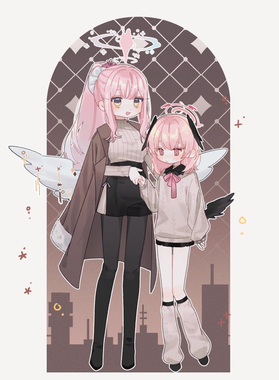 2girls alternate_costume black_footwear black_pantyhose black_skirt black_wings blue_archive brown_coat closed_mouth coat coat_on_shoulders halo head_wings highres koharu_(blue_archive) leg_warmers long_hair long_sleeves mika_(blue_archive) mini_wings multicolored_hair multiple_girls nagakiras2 open_mouth pantyhose pink_eyes pink_hair ponytail ribbed_sweater shoes sidelocks skirt sweater very_long_hair white_wings wing_ornament wings