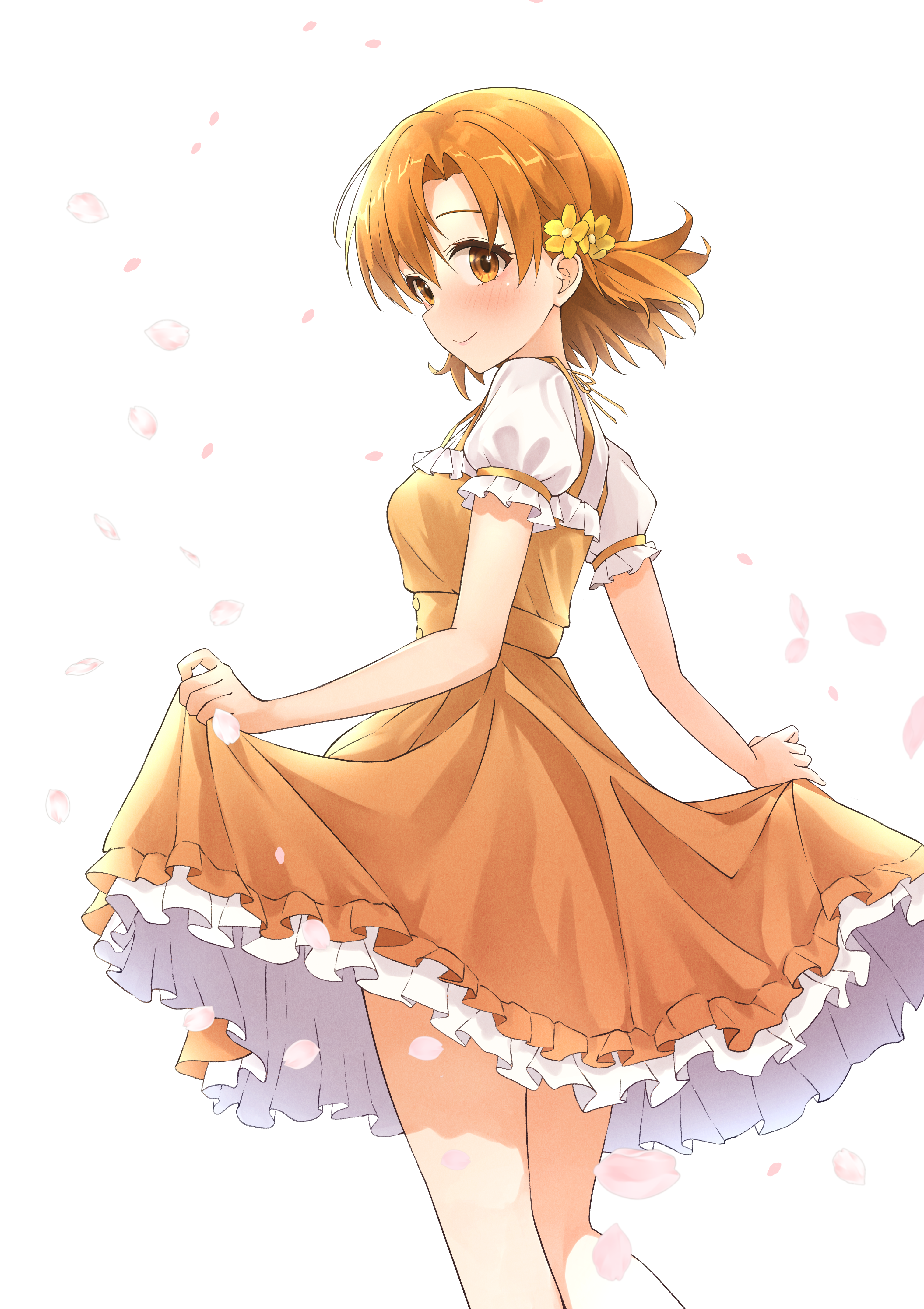 1girl absurdres b1ack_illust bare_legs blush breasts dress falling_petals feet_out_of_frame flower hair_flower hair_ornament highres holding_own_dress idolmaster idolmaster_million_live! looking_at_viewer looking_to_the_side orange_dress orange_hair petals pinafore_dress puffy_short_sleeves puffy_sleeves shirt short_sleeves sleeveless sleeveless_dress small_breasts smile solo white_shirt yabuki_kana