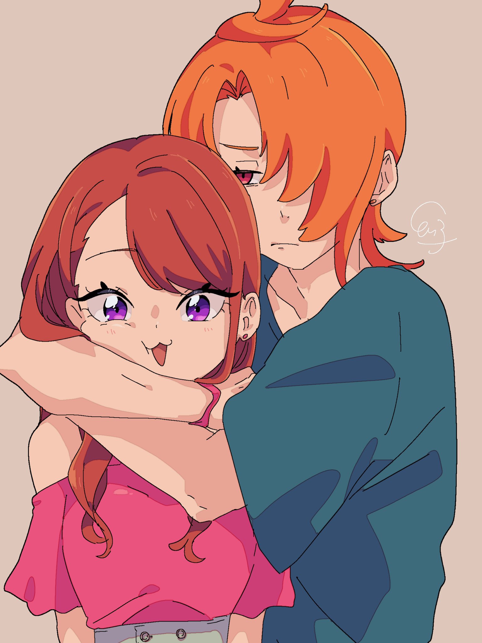 1boy 1girl aged_up blue_shirt hair_over_one_eye height_difference highres hijiri_ageha hirogaru_sky!_precure hug looking_at_viewer off_shoulder orange_hair pink_shirt precure puffy_short_sleeves puffy_sleeves purple_eyes red_hair shirt short_sleeves swept_bangs tricotroom upper_body yuunagi_tsubasa